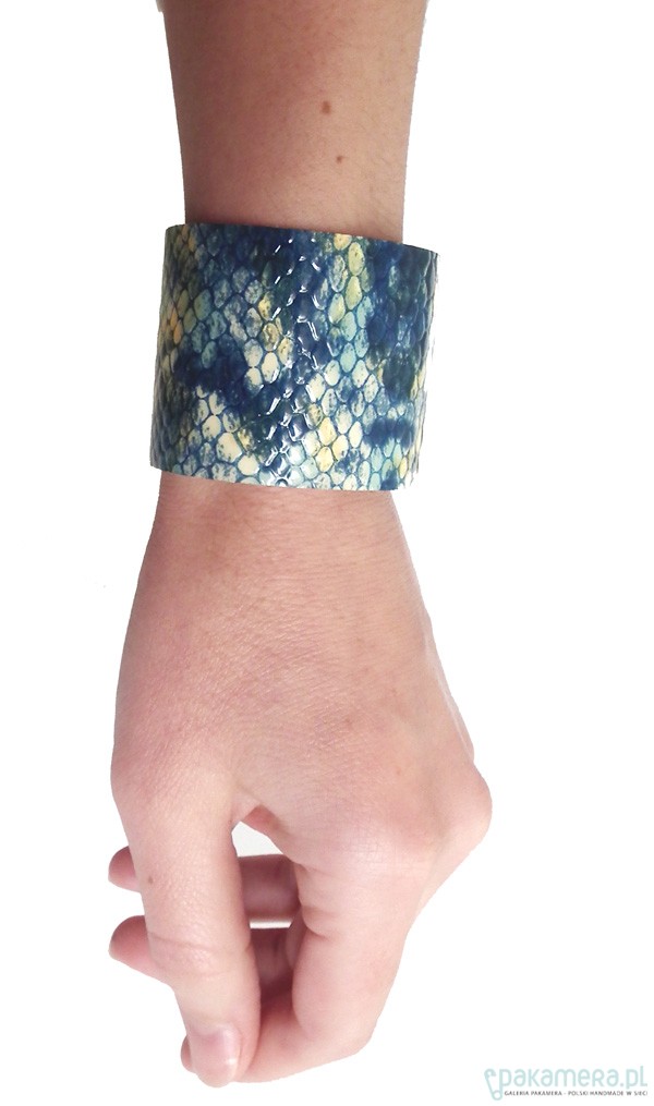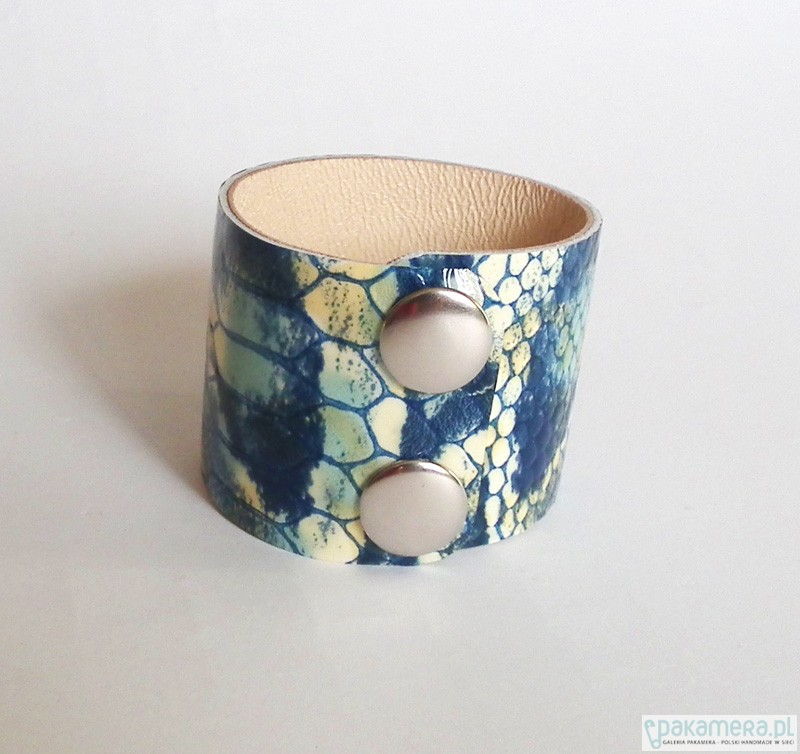 Bransoleta wykonana w całości ze skóry naturalnej swietnej jakości. Skóra jest unikatowa, imitująca łuski węża, lakierowana. W odcieniach niebieskiego, turkusu, złota. Podklejona skórą beżową. Bardzo estetycznie wykonana. Miękka, wygodna, nie drapiąca. Pasuje na nadgarstek o obwodzie 14,5 - 15,5cm. Szerokość około 4,5cm. Jeśli potrzebny jest inny rozmiar, proszę o kontakt. Zapinana na dwa zatrzaski. Opatrzona metką projektanta. Projekt autorski.