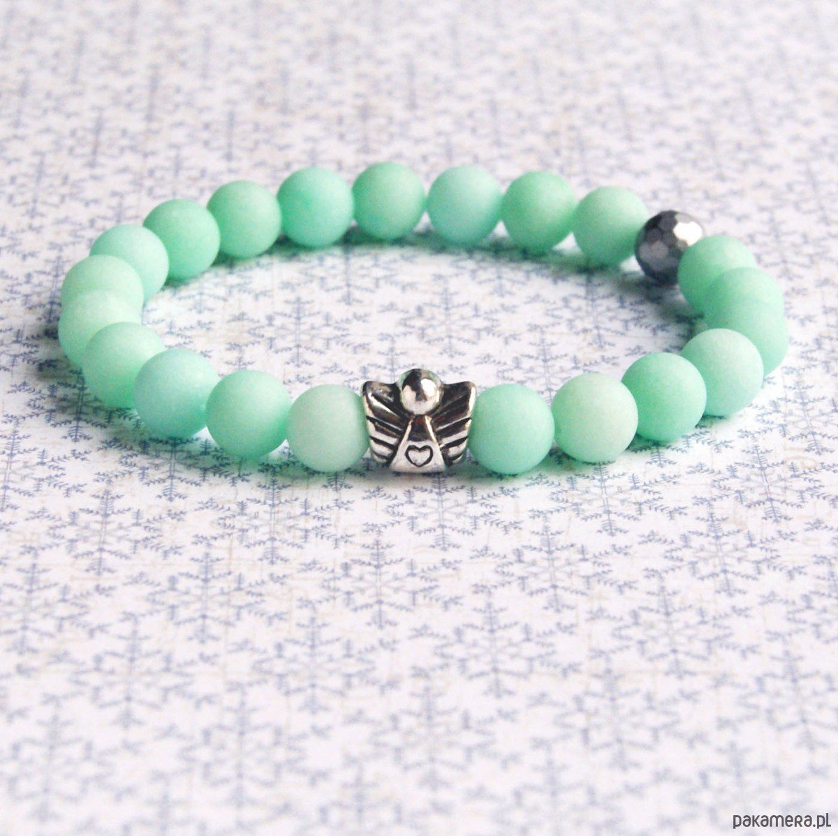 urocza bransoletka na solidnej lince elastycznej, wykonana z MATOWYCH kul miętowego jadeitu (8mm) oraz asymetrycznej kuli matowego, fasetowanego srebrnego hematytu i metalowych elementów w kolorze srebra - urocza przekładka : aniołek :) obw. wewnętrzny: 16,5CM....