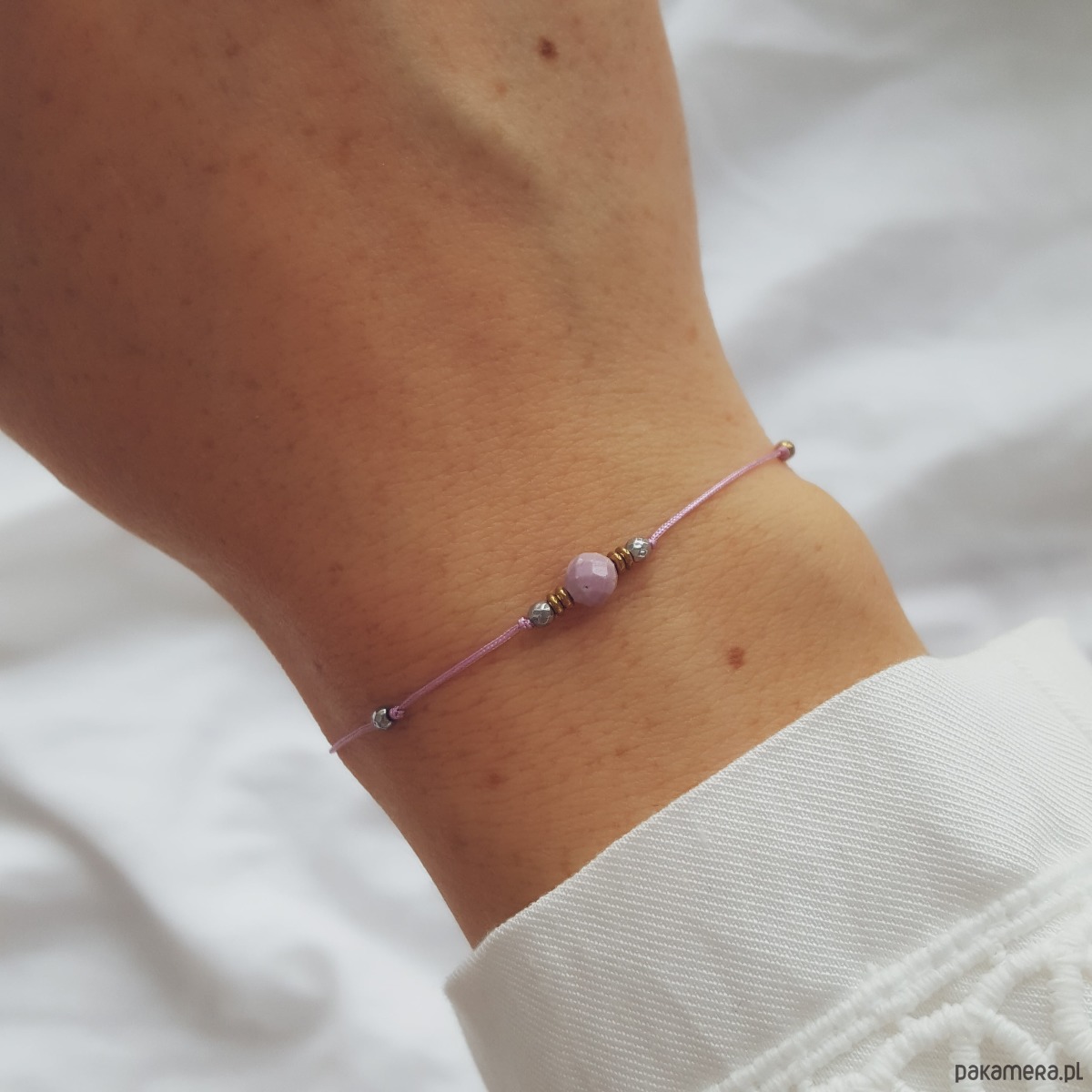 Minimalistyczna bransoletka na liliowym sznureczku z kamieniem fosfosyderytu. Oczko otaczają drobniejsze hematyty w kolorze złota i srebra. W boki bransoletki zostały wplecione pojedyncze, drobne kamienie hematytu i mały fosfosyderyt. Bransoletka ma regulowaną wielkość, więc będzie pasować na każdy rozmiar nadgarstka i świetnie sprawdzi się jako niezobowiązujący upominek.