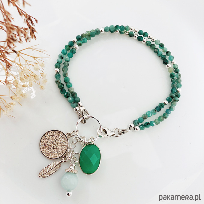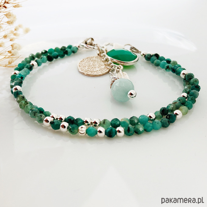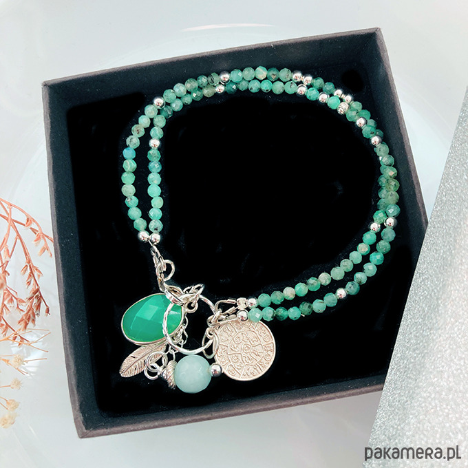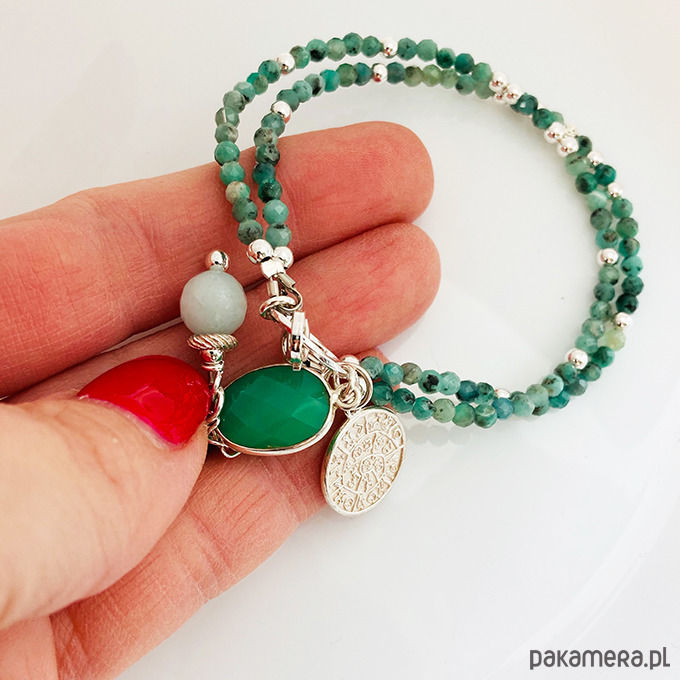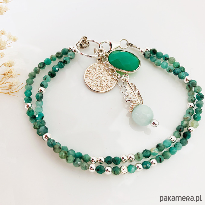 Wyjątkowa , efektowna bransoletka wykonana z dwóch sznurów kamieni- naturalnego szmaragdu z delikatnymi zawieszkami ze srebra- monetką oraz agatem w oprawie i akwamarynem . Wykonana ręcznie z naturalnych kamieni i srebrnych koralików i elementów.