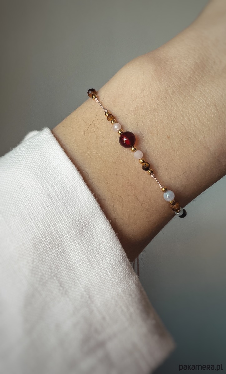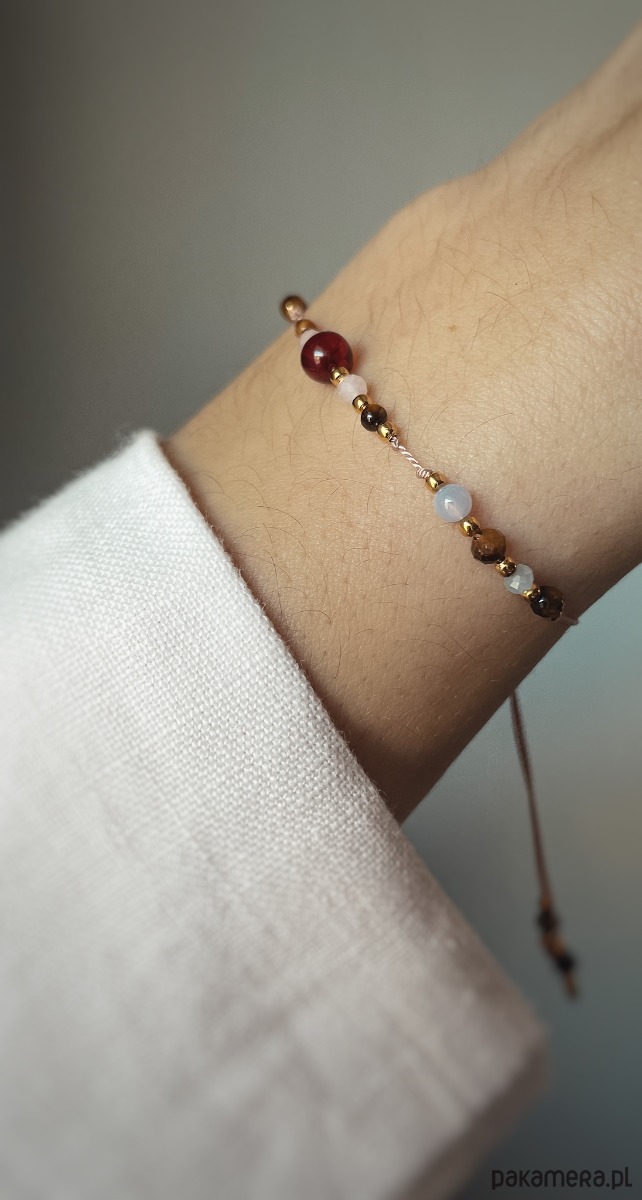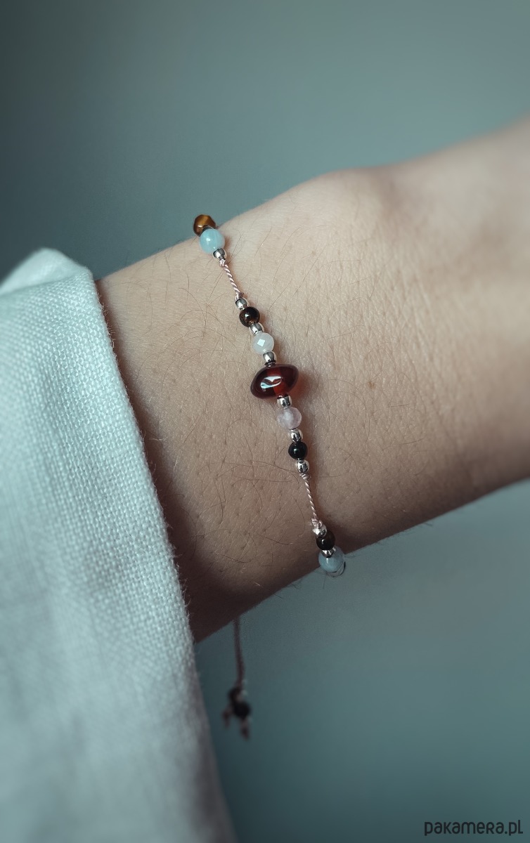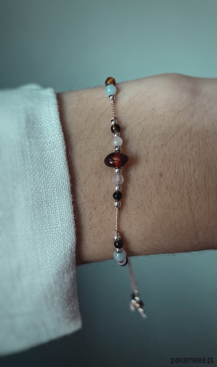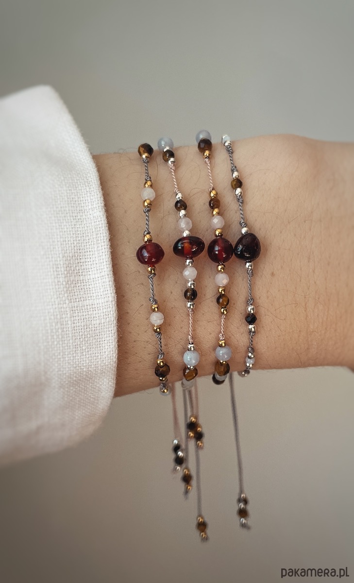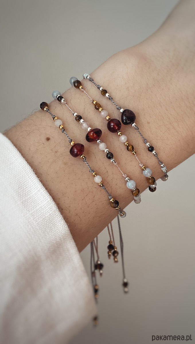 1) Bransoletki na nici jedwabnej z kamieniami naturalnymi (tygrysie oko, bursztyn, chalcedon, akwamaryn, kryształ górski)