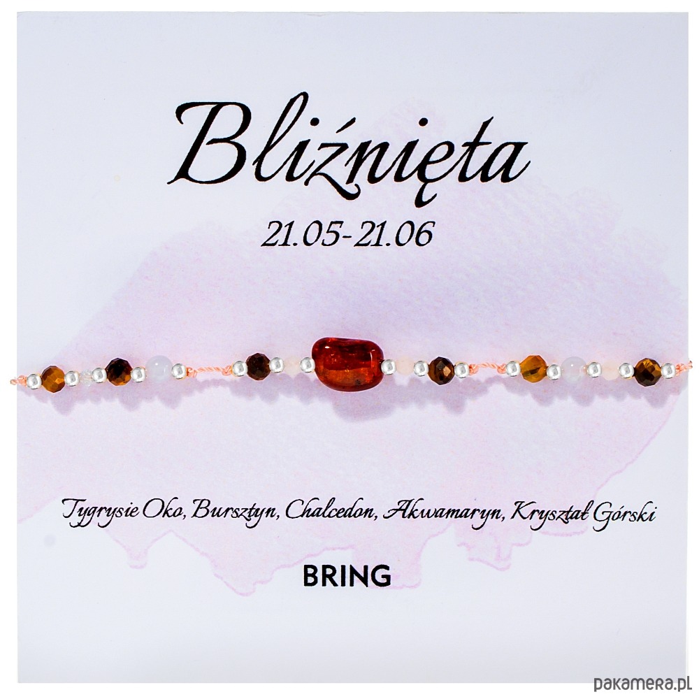 Bransoletka na nici jedwabnej z kamieniami naturalnymi, przekładana kulkami ze srebra próby 925. Są to kamienie odpowiednie znaku zodiaku Bliźnięta. Zestaw składa się z: