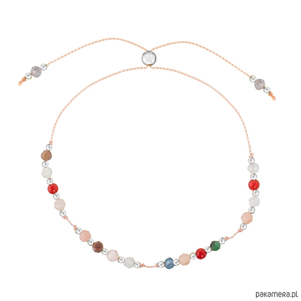 Bransoletka na nici jedwabnej z kamieniami naturalnymi, przekładana kulkami ze srebra próby 925. Są to kamienie odpowiednie znaku zodiaku Rak. Zestaw składa się z: