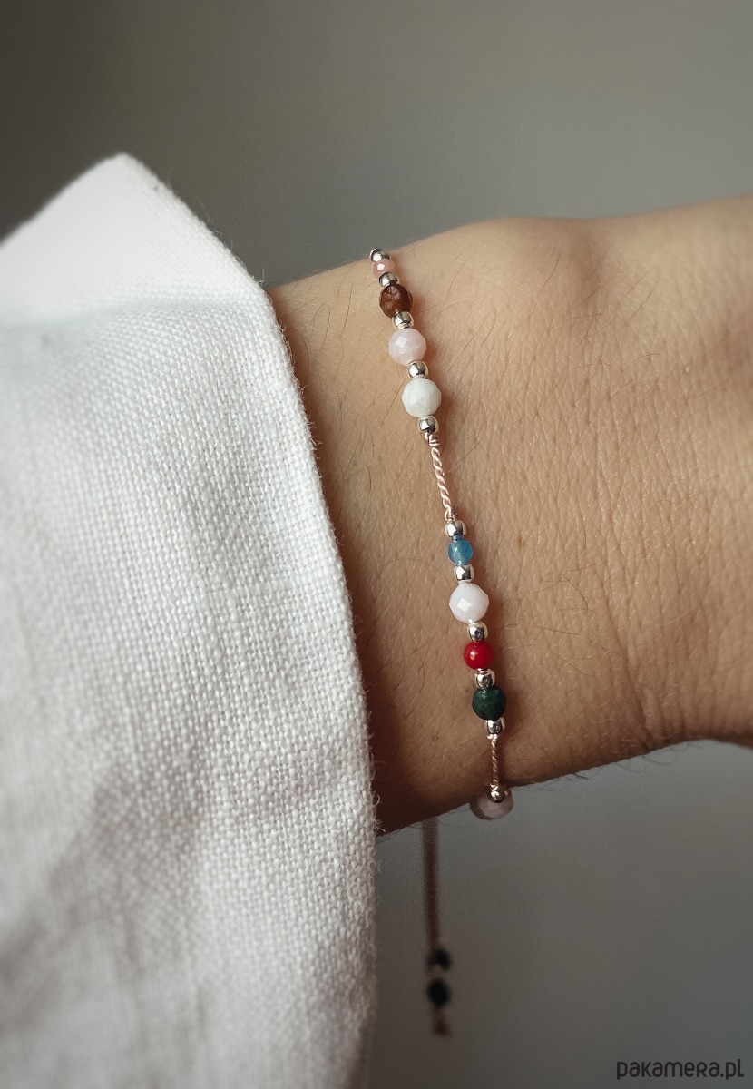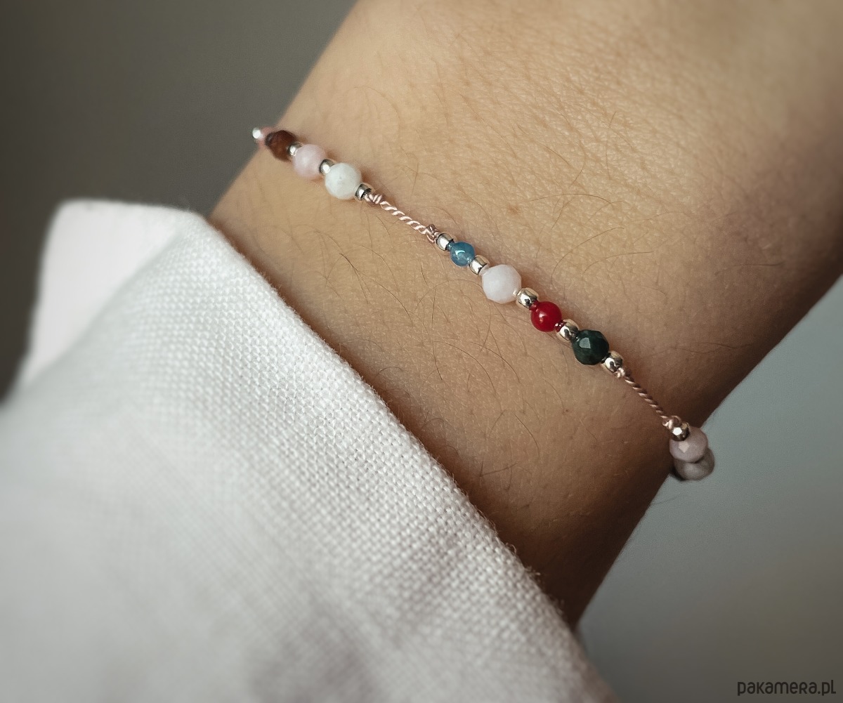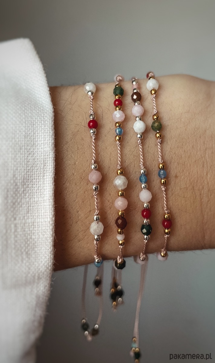 1) Bransoletki na nici jedwabnej z kamieniami naturalnymi (jaspis, koral, jadeit, opal, kamień księżycowy, szmaragd)