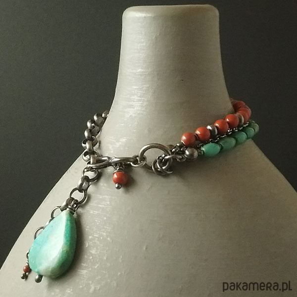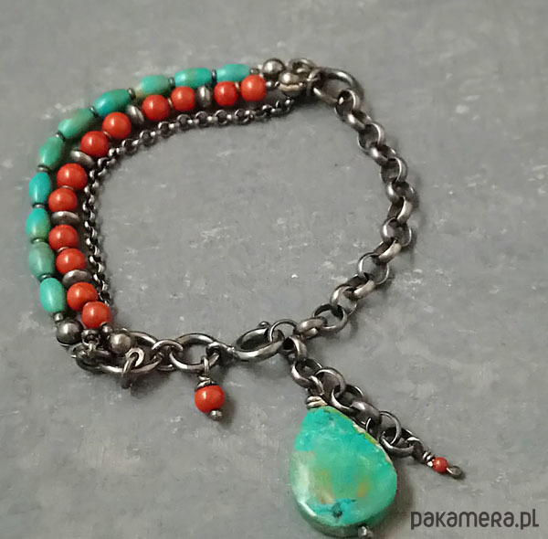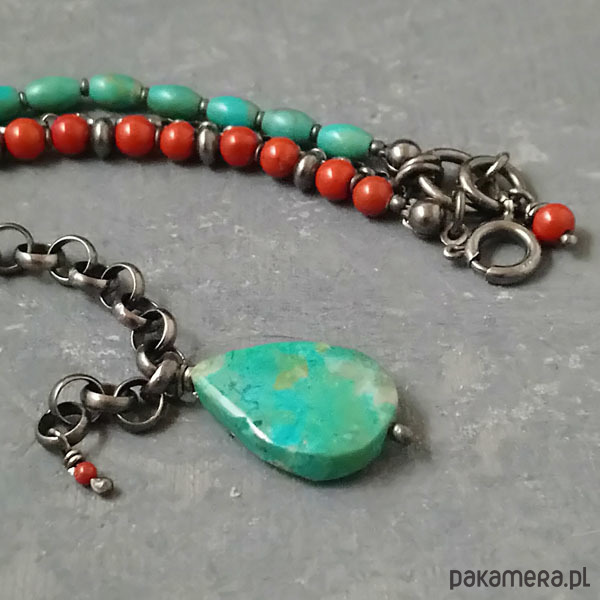 Bransoletka wykonana z oksydowanego srebra próby 925, kropli chryzokoli wielkości 19x14 mm, oliwek naturalnego turkusu 6 mm oraz jaspisu. Całkowita długość bransolety wynosi 21 cm. Obwód regulowany, będzie pasowała na nadgarstek do 18 cm. Polecam !