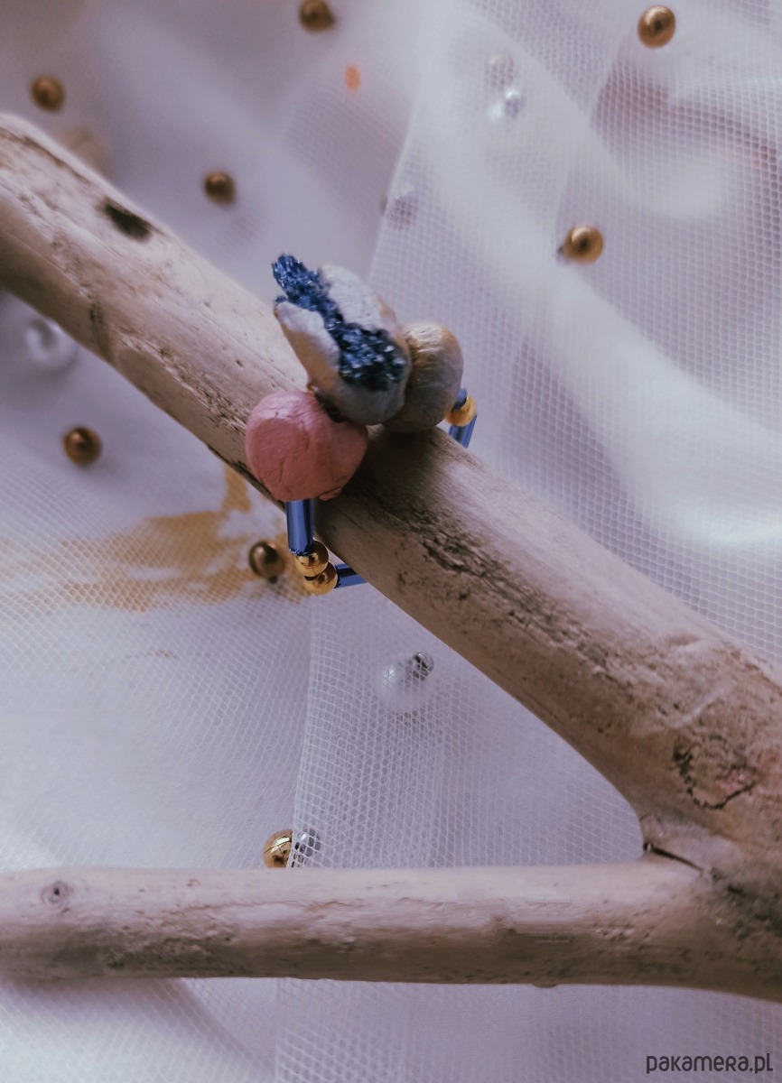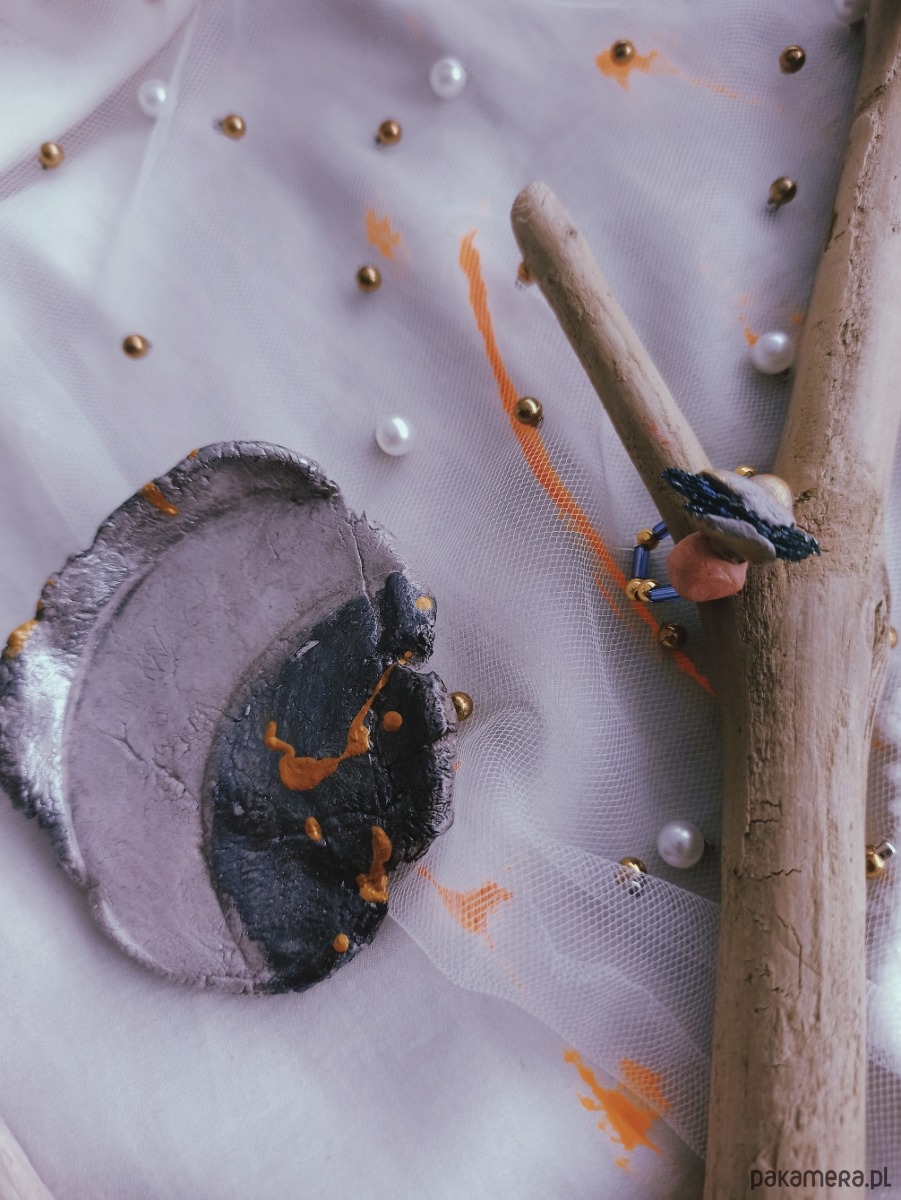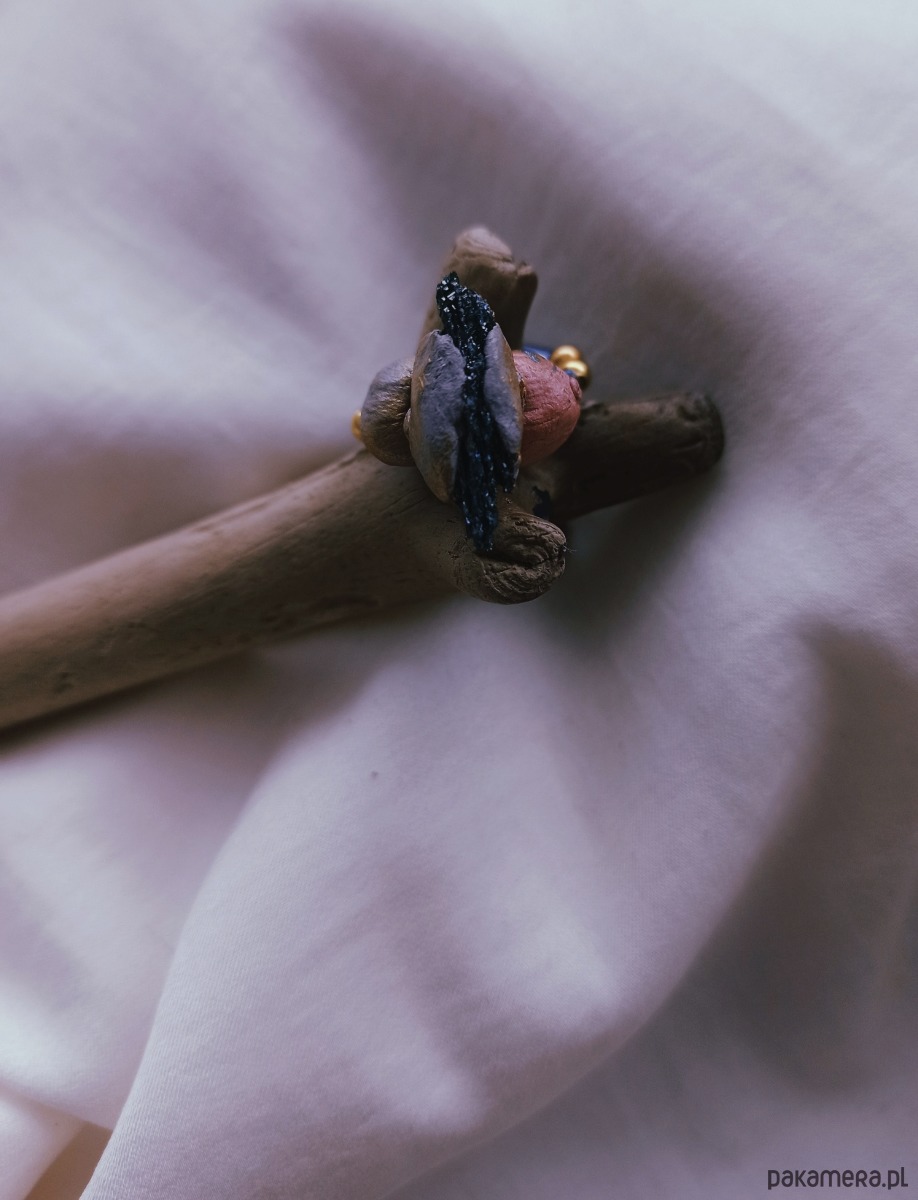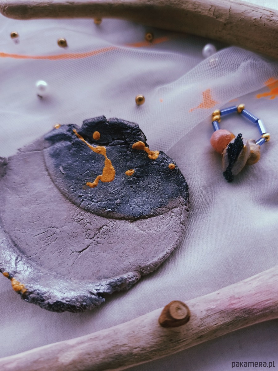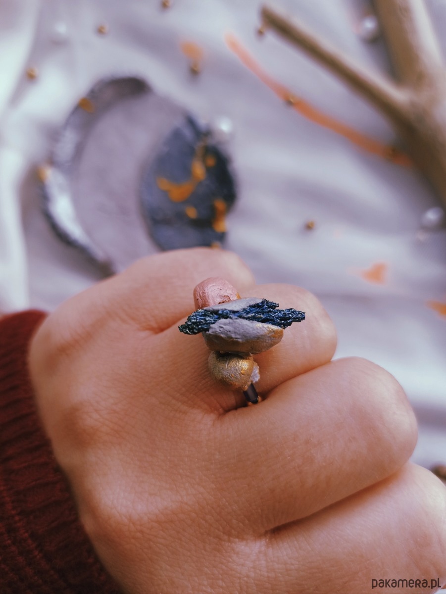 Pierścionek z kwarcem tytanowym oraz gliną i koralikami vintage + podstawką na biżuterię z motywem Księżyca.