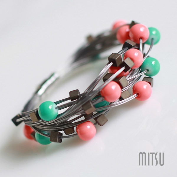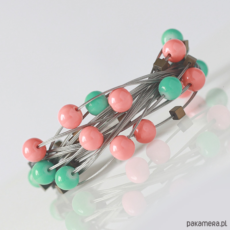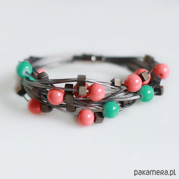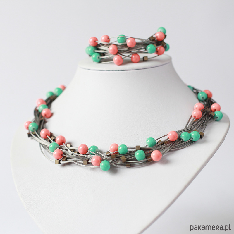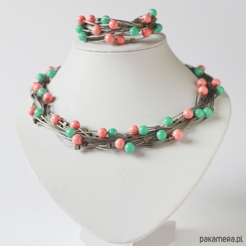 Komplet zapleciony na bazie stalowych linek krytych nylonem ze szklanych koralików w kolorze turkusowym i koralowym oraz kostek hematytu w kolorze starego złota.