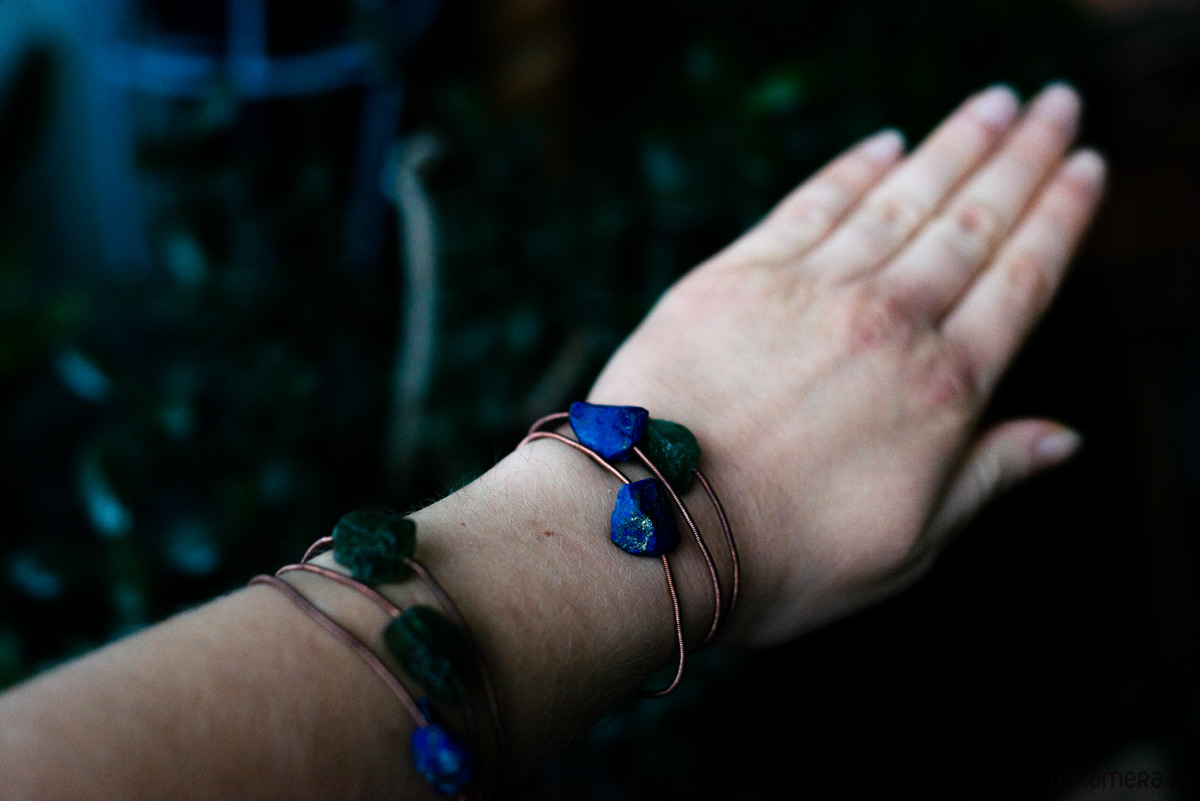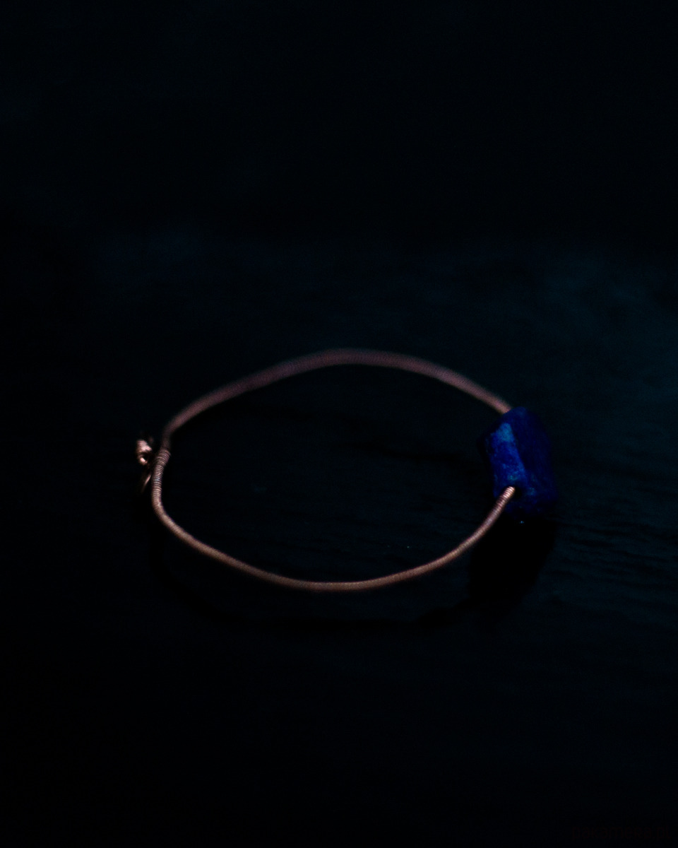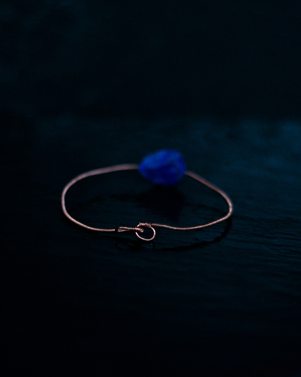Bransoletka ręcznie pleciona z miedzi z naturalnym lapisem lazulim.