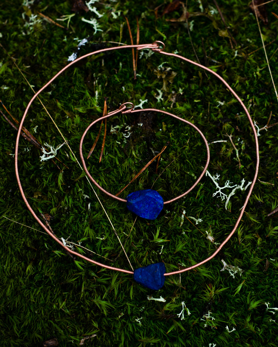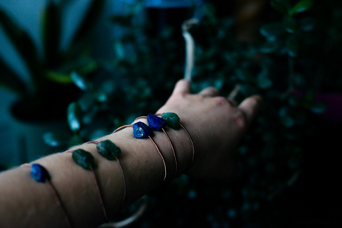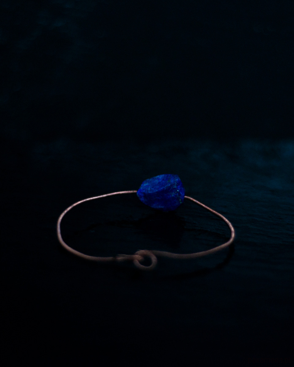 Bransoletka ręcznie pleciona z miedzi z naturalnym lapisem lazulim.