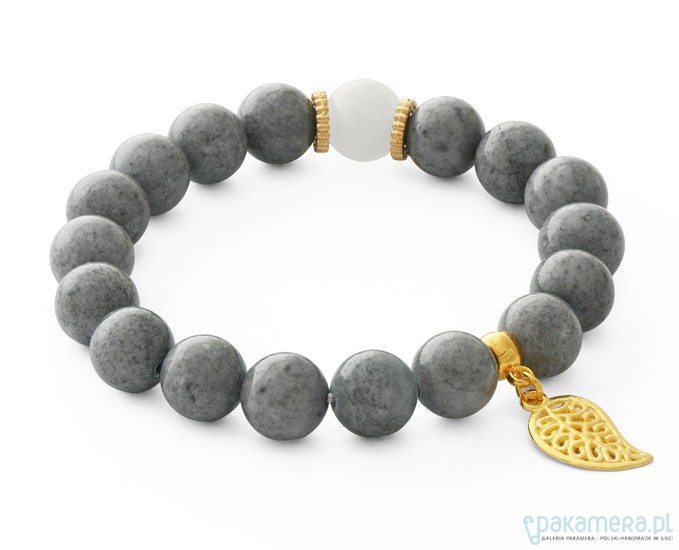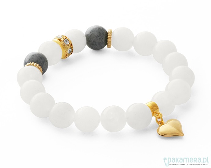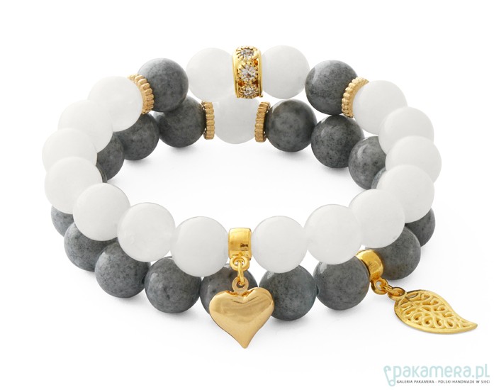 Zestaw modnych i delikatnych dwóch bransoletek na gumce silikonowej w kolorach księżycowym i szarym. Wykonany z naturalnych jadeitów (kulka 10 mm ) oraz koralika z cyrkoniami i zawieszek w kolorze złota (antyalergicznych) Pasuje na nadgarstek od 16 cm -17 cm (rozmiar standardowy). Istnieje możliwość wykonania bransolet w innych rozmiarach, prosimy o kontakt ;)