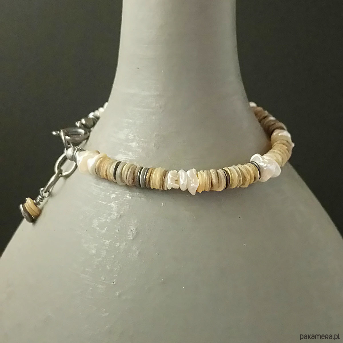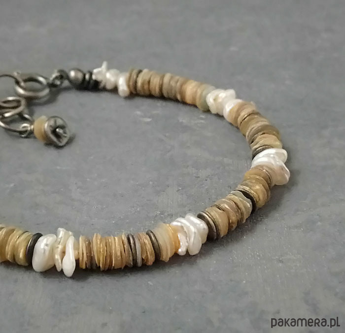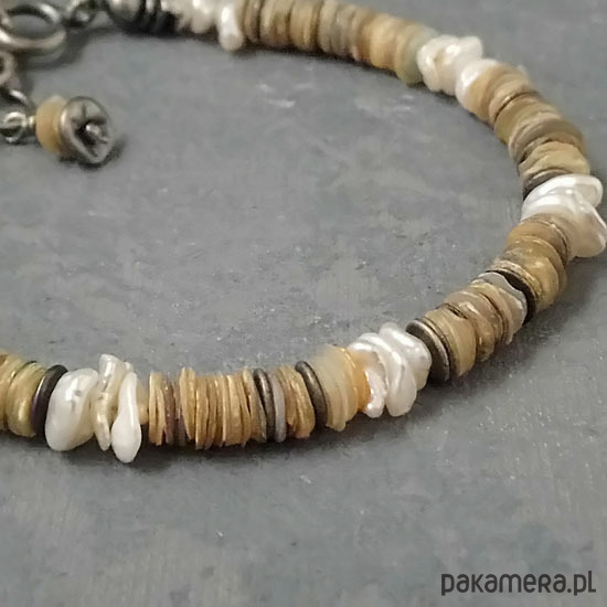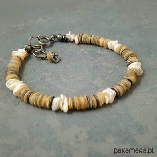Delikatna bransoletka w letnim klimacie :) wykonana z oksydowanego srebra próby 925, krążków muszli wielkości 5 mm oraz białych, pięknie opalizujących pereł keshi. Pomiędzy muszlę wplecione krążki ze srebra. Całkowita długość bransolety 20 cm. Będzie pasowała na nadgarstek 15-17 cm. Polecam !