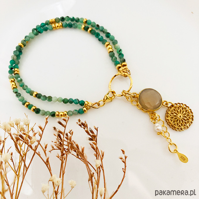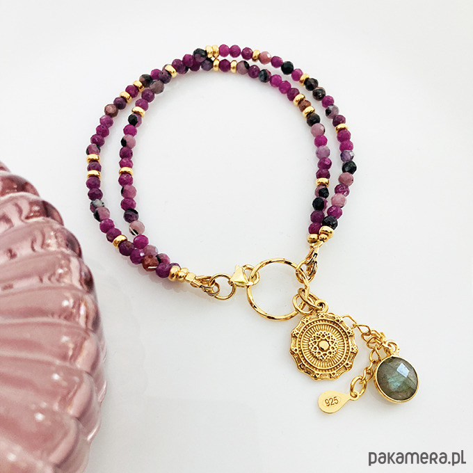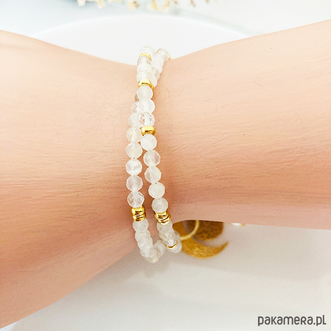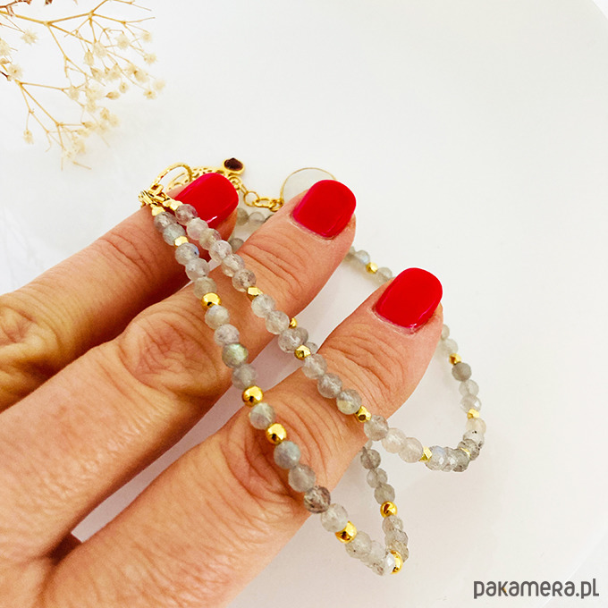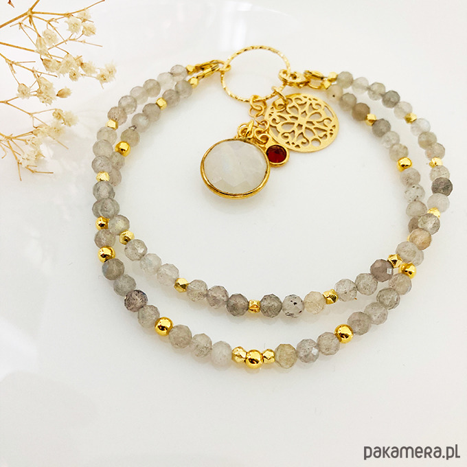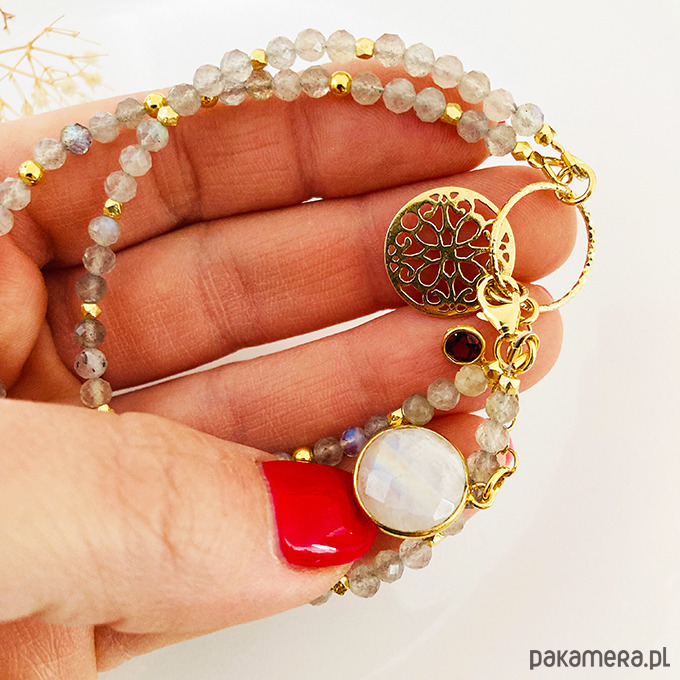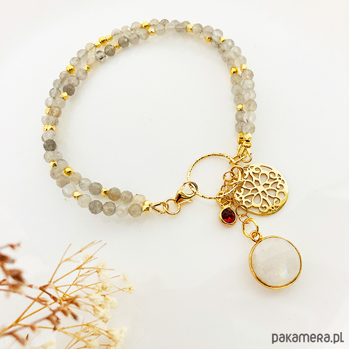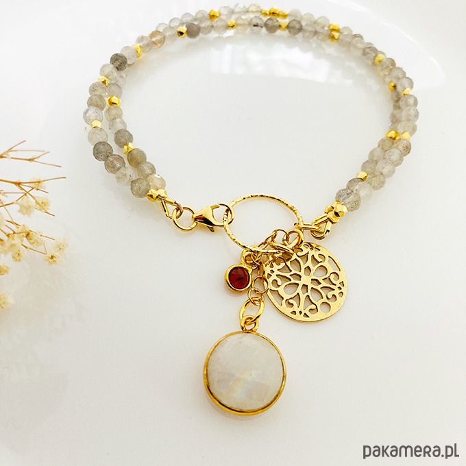 Efektowna podwójna bransoletka z pięknych fasetowanych labradorytów z delikatną zawieszką oraz oprawionym kamieniem księżycowym. Wykonana ręcznie z dwóch sznurów labradorytu , naturalnych kamieni i srebrnych złoconych 24 k złotem koralików i elementów.
