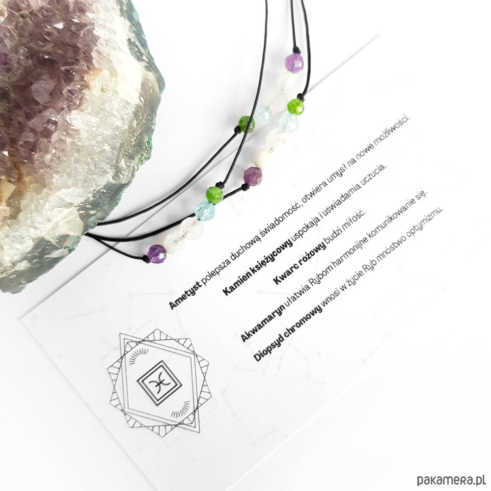 Bransoletka wykonana z kamieni naturalnych przypisywanych osobom spod znaku Ryb - ametystu, kamienia księżycowego, kwarcu różowego, akwamarynu i diopsydu chromowego.