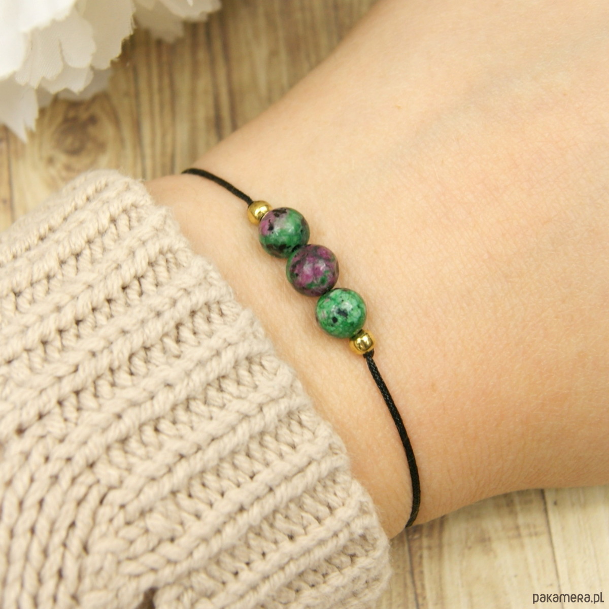 Delikatna bransoletka z czarnego sznurka jubilerskiego oraz zoisytem z rubinem. W uniwersalnym rozmiarze - bransoletka dopasowuje się do nadgarstka dzięki splotowi makramowemu. Klasyczna i elegancka. Idealna na prezent dla bliskiej osoby.