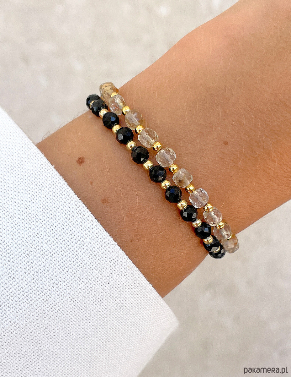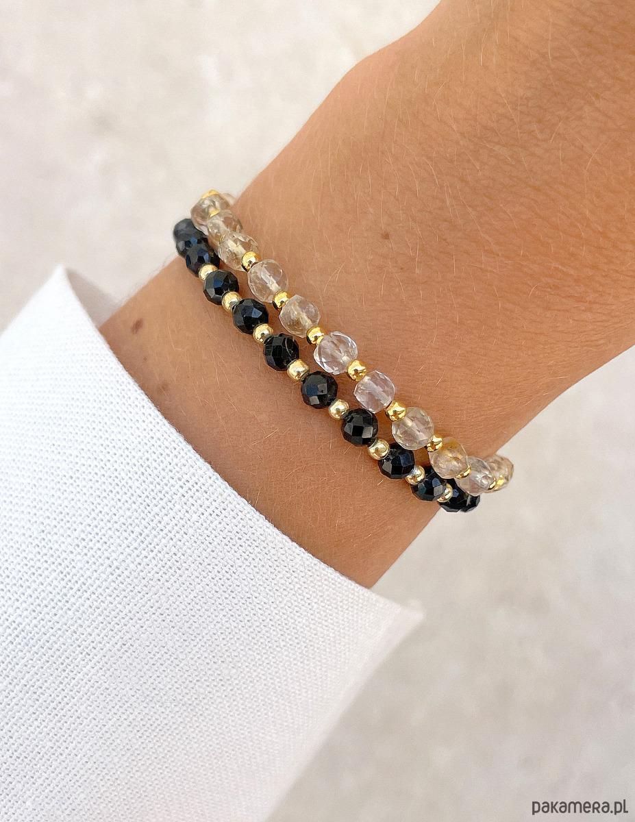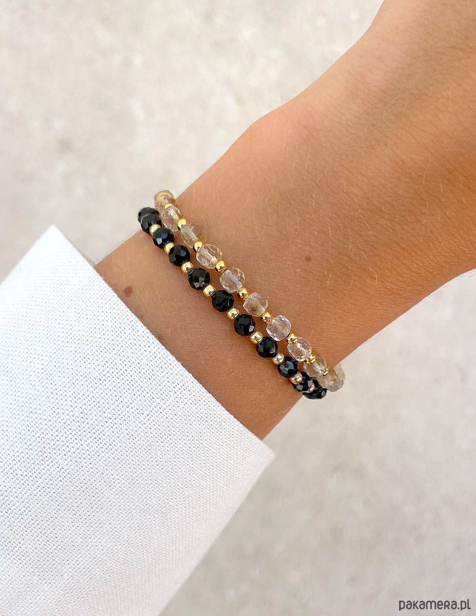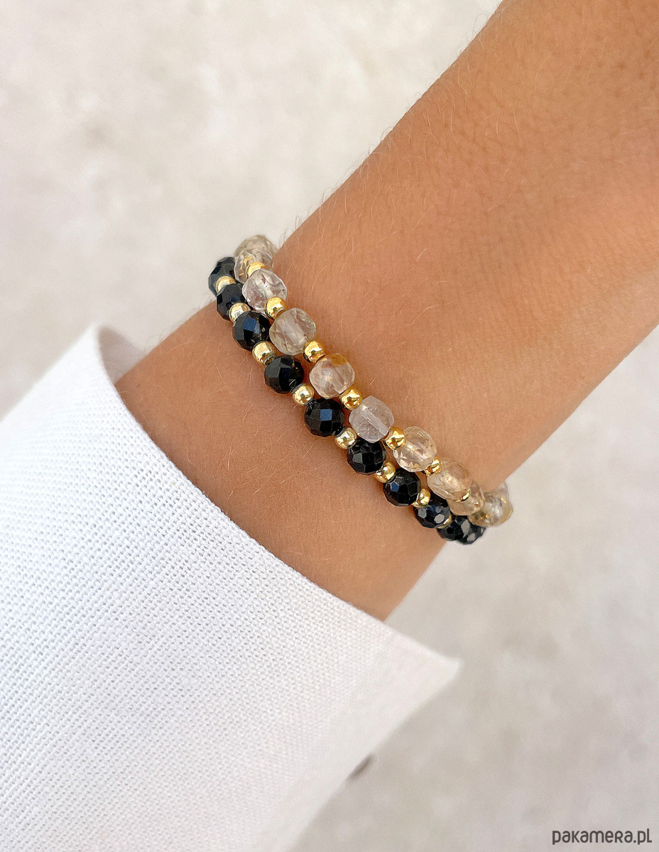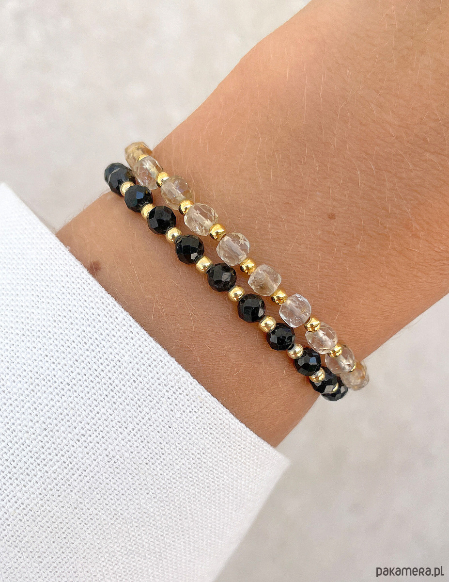 Druga bransoletka to eleganckie połączenie fasetowanych kulek czarnego turmalinu (ok. 4 mm) z minimalistycznym blaskiem złotego hematytu (ok. 3 mm). Czarny turmalin to kamień o silnych właściwościach ochronnych, który chroni przed negatywną energią. Pomaga także w utrzymaniu równowagi i spokoju, działając jak tarcza przed stresem i lękiem.
