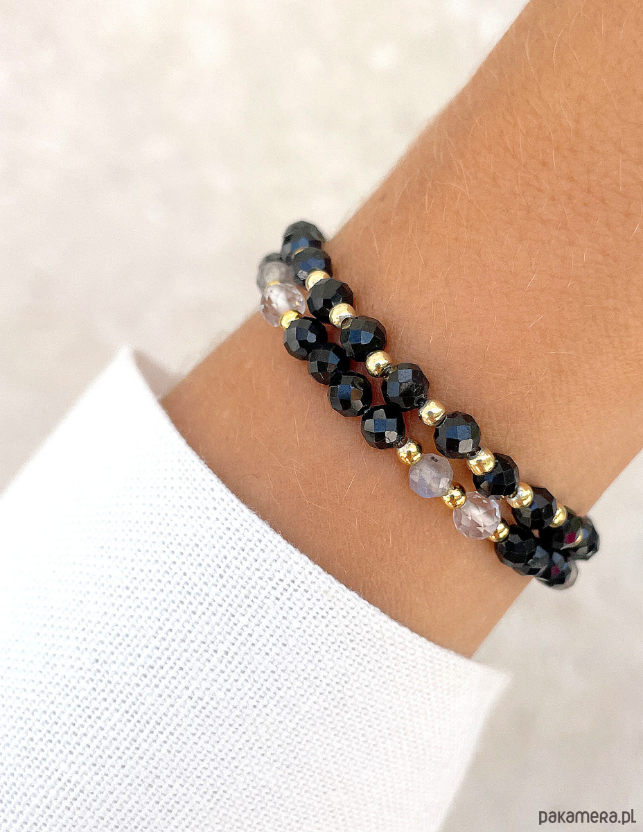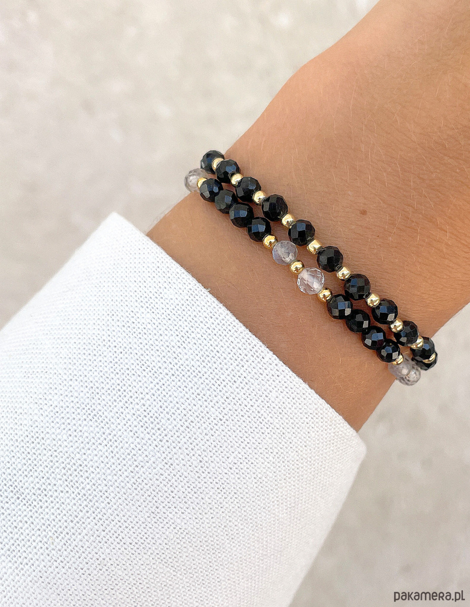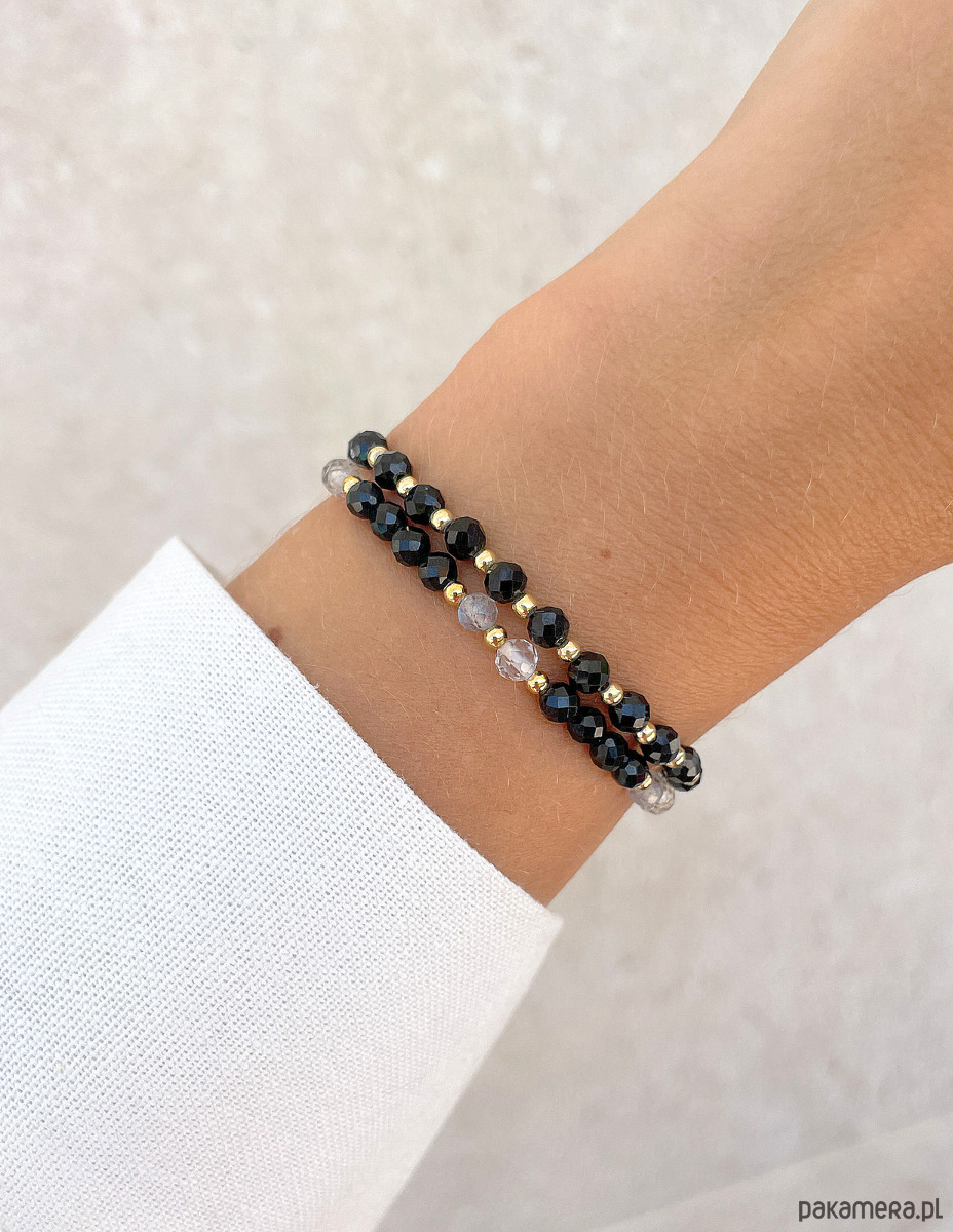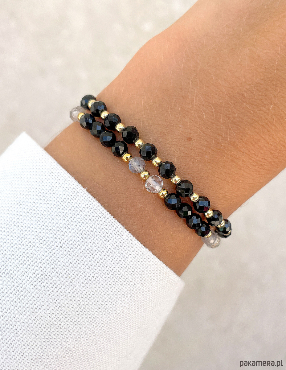 Druga bransoletka to harmonijna mieszanka odcieni i refleksów. Bazę stanowią fasetowane kulki czarnego turmalinu, które tworzą głębię. Przeplatają się one z tajemniczym, szarym labradorytem (ok. 4 mm), który w świetle ukazuje wyjątkowe, niebieskie łuny. Całości dopełnia przezroczysty kryształ górski (ok. 4 mm), który dodaje kompozycji lekkości i blasku. Wszystkie kamienie łączy złoty hematyt (ok. 3 mm).