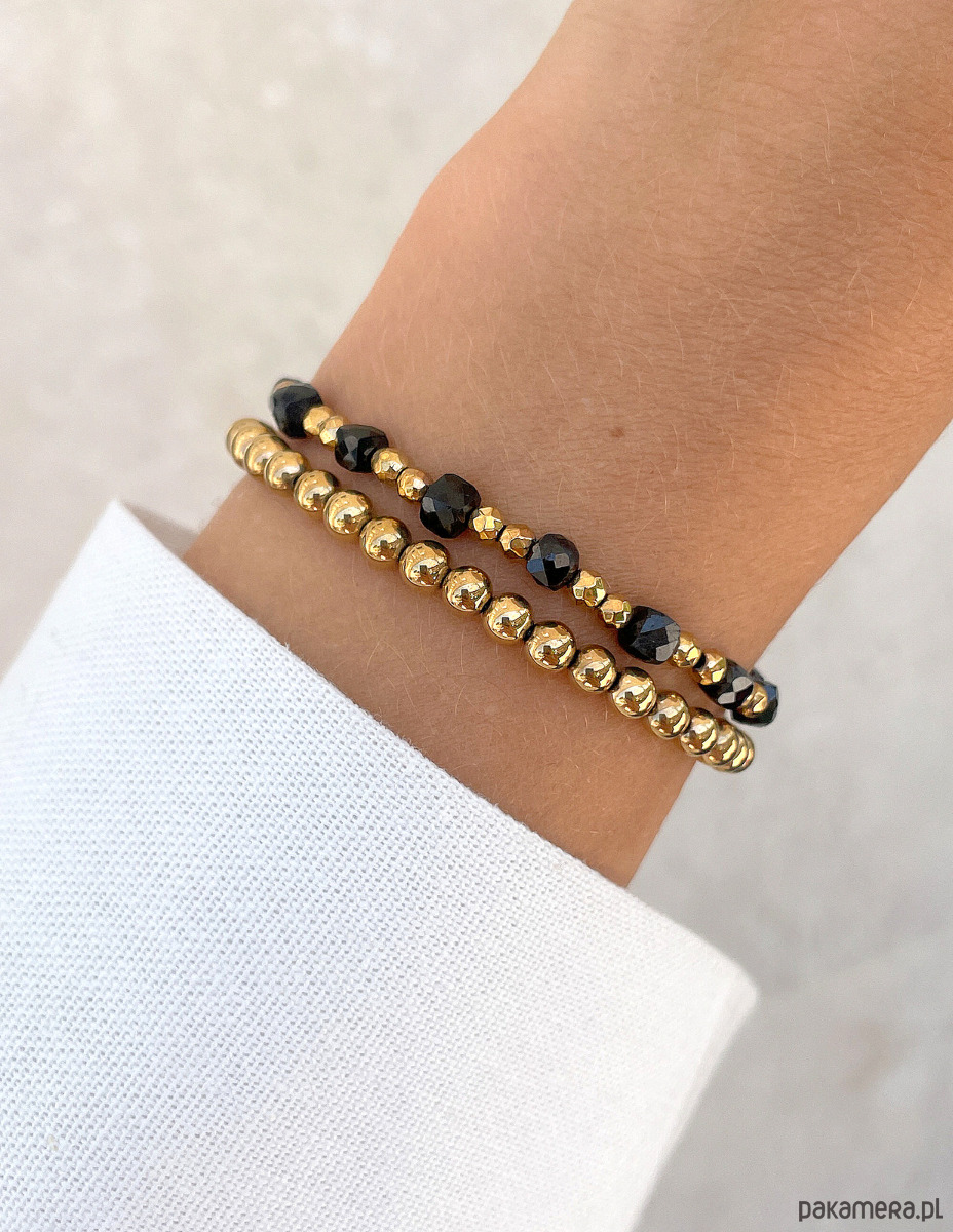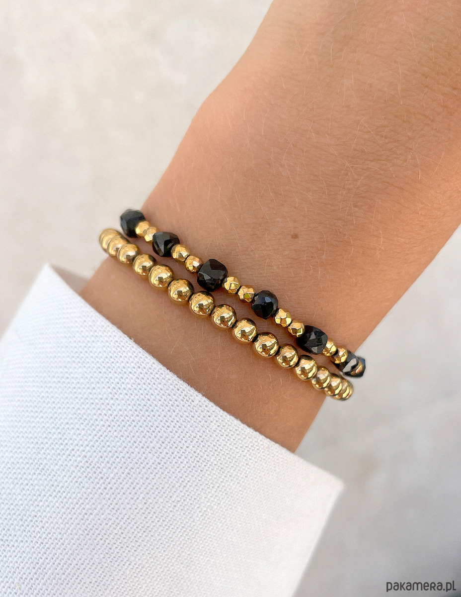 Zestaw składa się z dwóch bransoletek. Pierwsza została wykonana w całości z gładkich kuleczek hematytu w kolorze złotym o średnicy około 4 mm. Druga bransoletka to harmonijne połączenie fasetowanych kostek czarnego turmalinu o średnicy około 4 mm oraz lśniących, fasetowanych kuleczek hematytu o średnicy około 2,5 mm, które nadają całości wyrafinowanego i nowoczesnego charakteru. Połączenie głębokiej czerni z lśniącym złotem sprawia, że bransoletki stanowią elegancki i ponadczasowy duet.