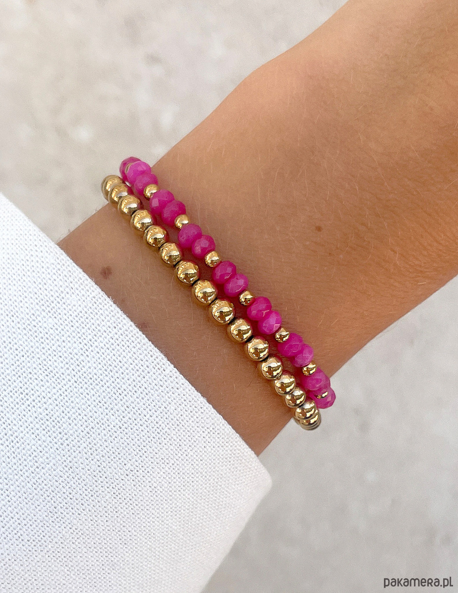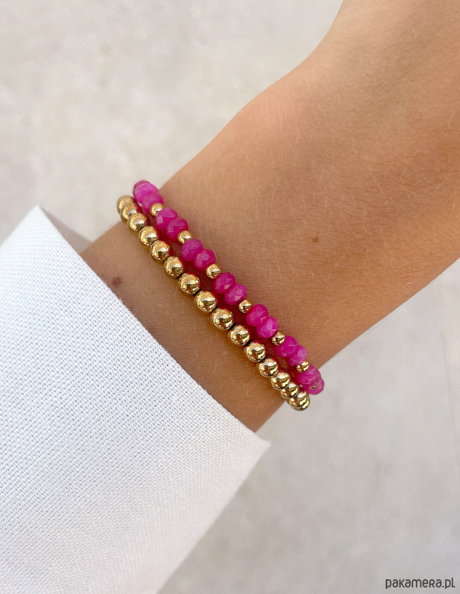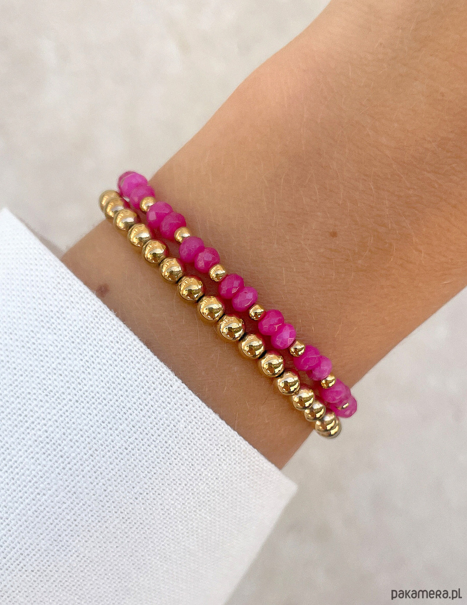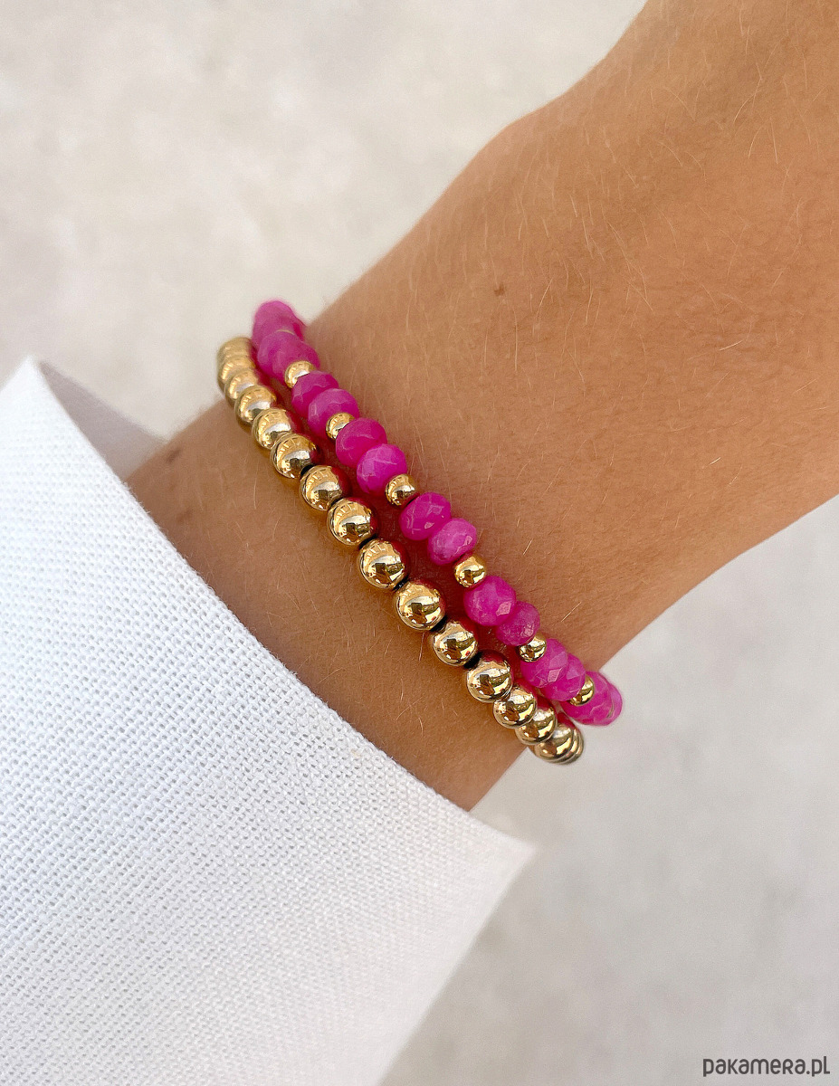 Pierwsza bransoletka składa się z gładkich, złotych kuleczek hematytu (ok. 4 mm), które pięknie odbijają światło. Druga bransoletka to urocze połączenie fasetowanych oponek jadeitu w odcieniu subtelnego różu (ok. 4 mm) z mniejszymi, złotymi kuleczkami hematytu (ok. 2,5 mm).