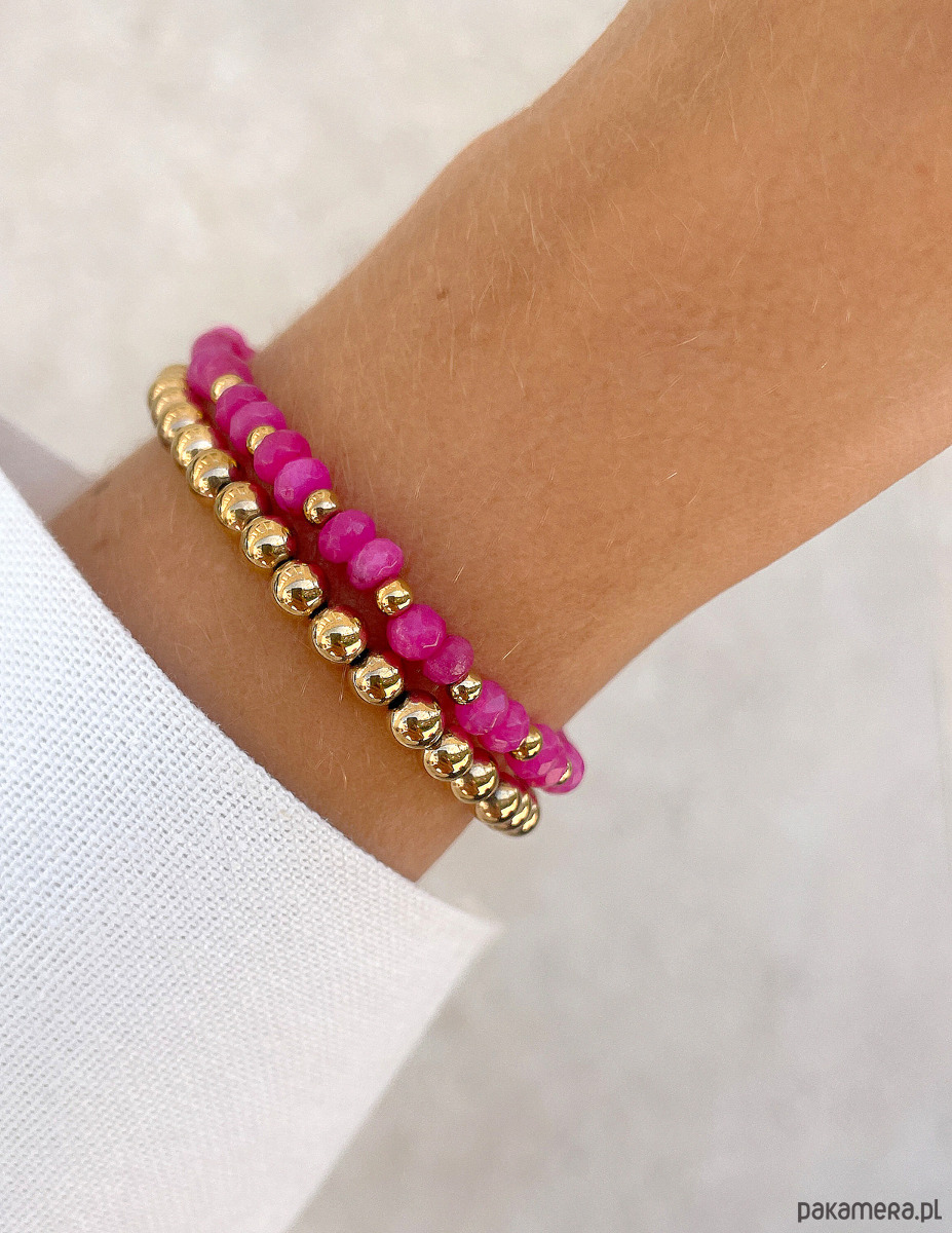 Zestaw dwóch bransoletek na żyłce elastycznej z kamieni naturalnych – Jadeit Różowy z Hematytem w kolorze złotymKamień: jadeit, hematyt