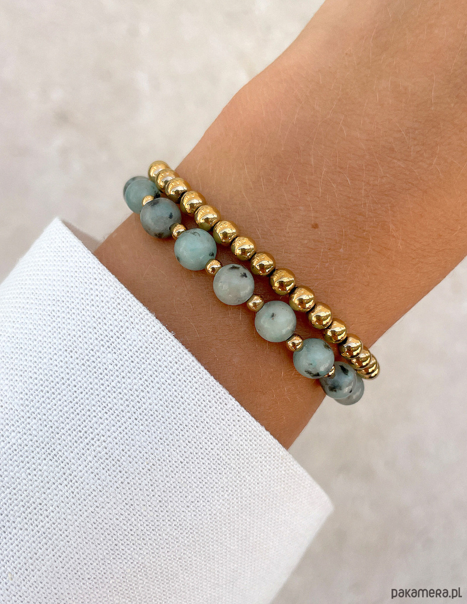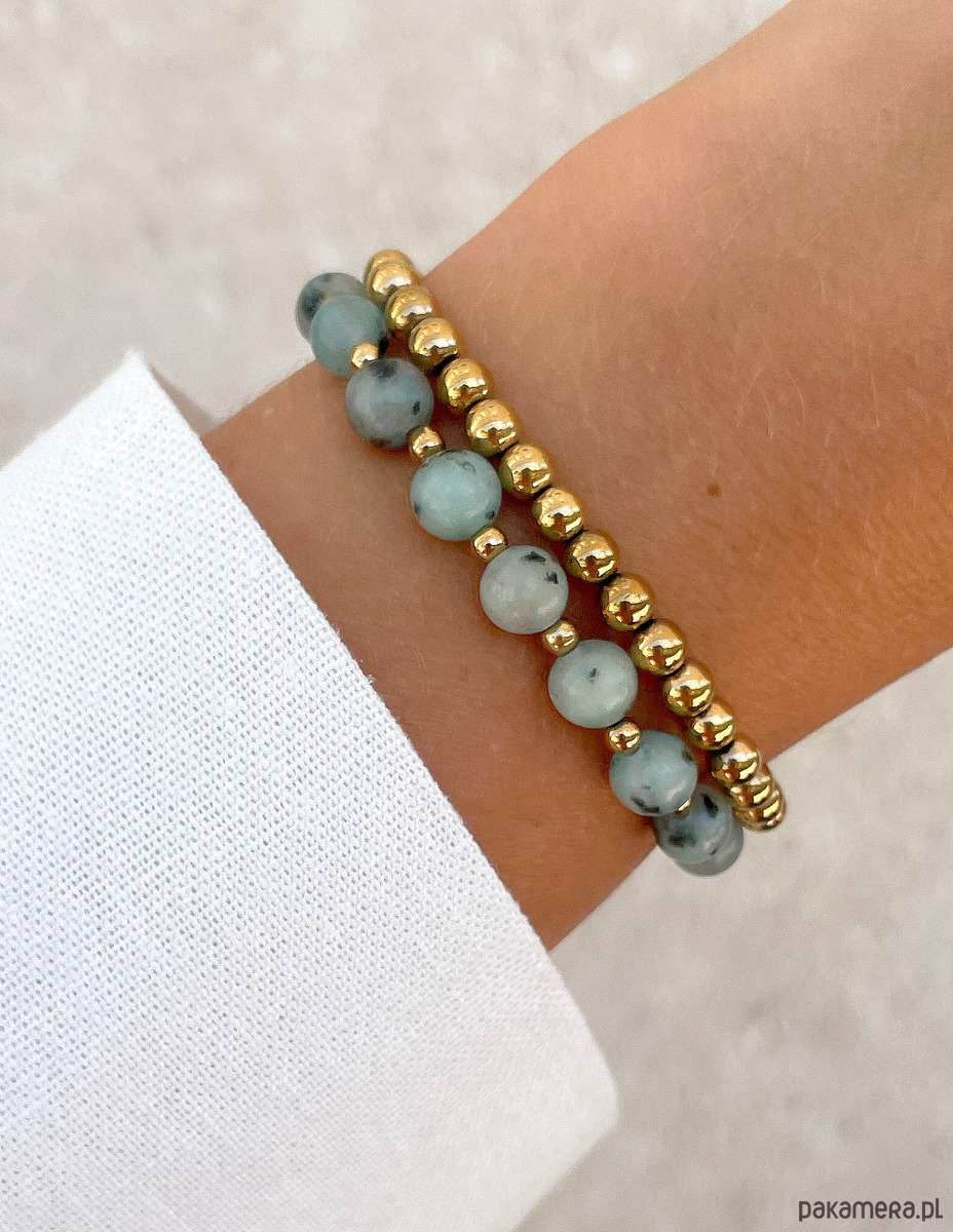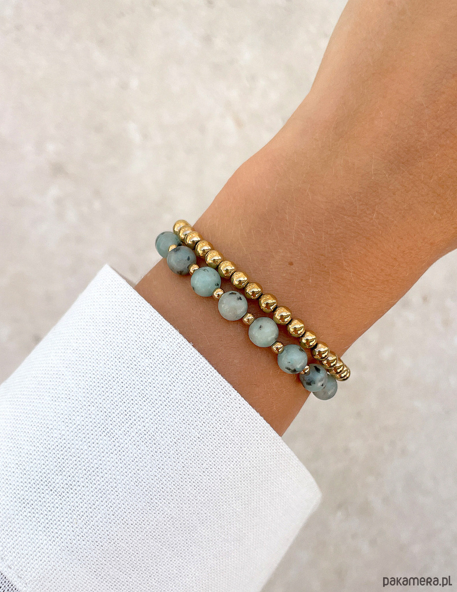 Zestaw składa się z dwóch bransoletek. Pierwsza została w całości wykonana z gładkich kuleczek hematytu w kolorze złotym o średnicy około 4 mm. Druga bransoletka to harmonijne połączenie gładkich kuleczek jaspisu kiwi o średnicy około 6 mm oraz mniejszych, gładkich kuleczek hematytu w kolorze złotym o średnicy około 3 mm, które nadają całości wyrafinowanego i nowoczesnego charakteru. Kamienie jaspisu zachwycają niepowtarzalnymi, jasnoniebieskozielonymi odcieniami z wtrąceniami, co sprawia, że każdy kamień jest jedyny w swoim rodzaju. Dzięki wykorzystaniu wytrzymałej, elastycznej żyłki jubilerskiej, bransoletki są nie tylko piękne, ale także niezwykle komfortowe w noszeniu.