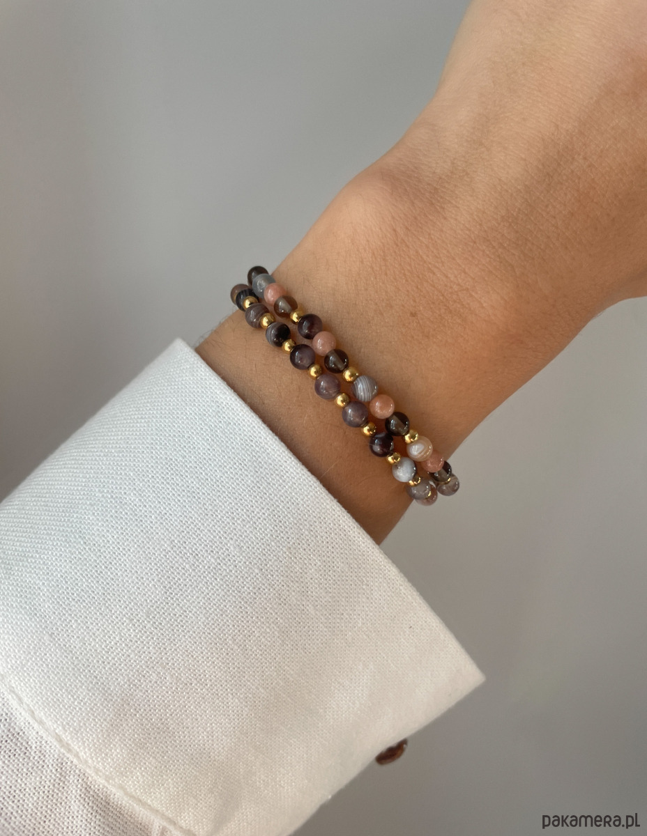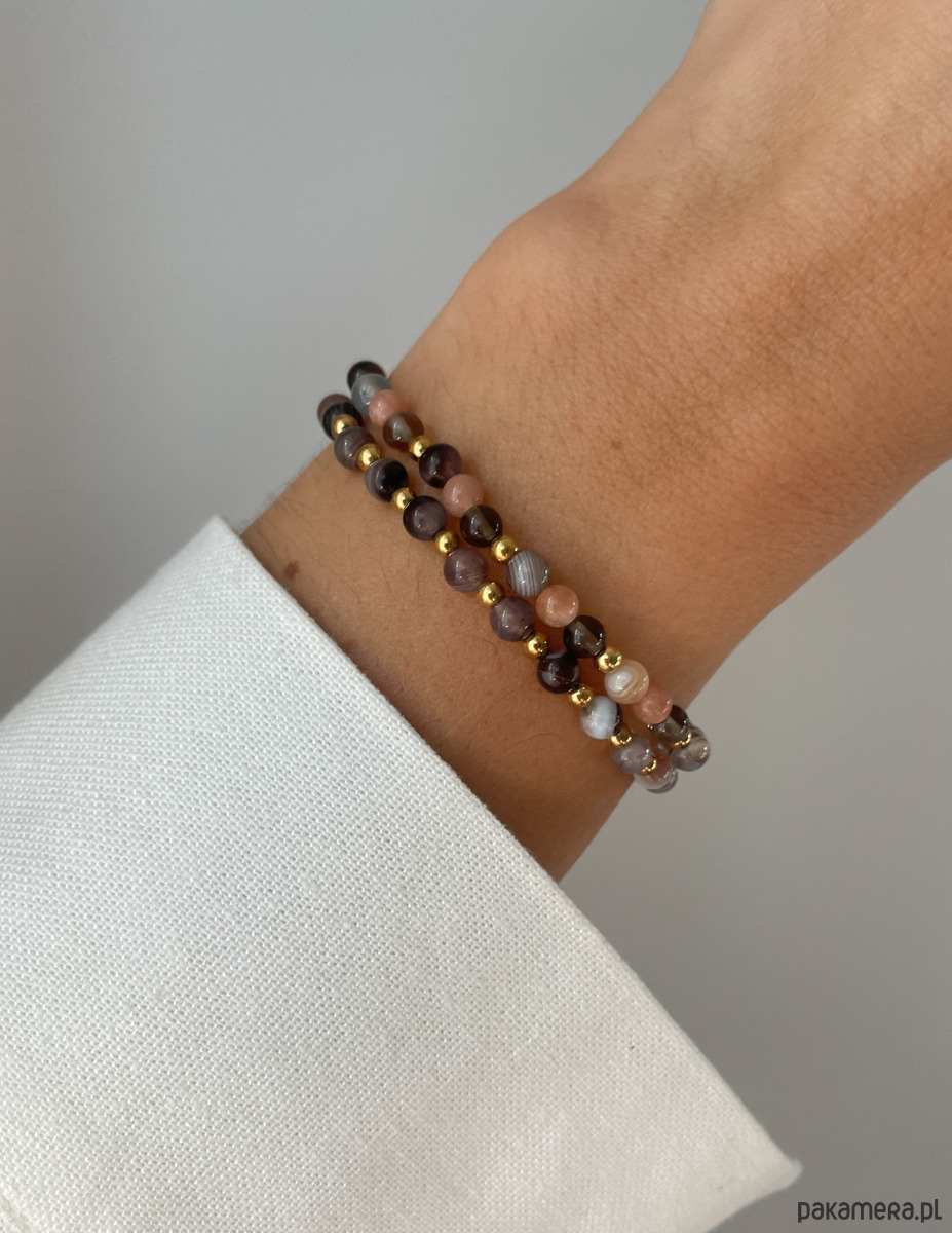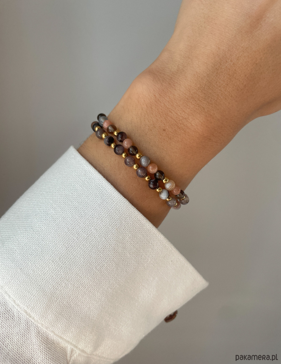 Bransoletki zostały wykonane na wytrzymałej, elastycznej żyłce jubilerskiej, co gwarantuje łatwość zakładania i idealne dopasowanie. Zestaw składa się z wyselekcjonowanych kamieni o wielkości ok. 4 mm: tajemniczego Kwarcu Dymnego, pasiastego Agatu Botswana oraz mieniącego się Kamienia Słonecznego. Całość dopełniają złote akcenty Hematytu (ok. 2,5-3 mm), nadające biżuterii luksusowego sznytu.