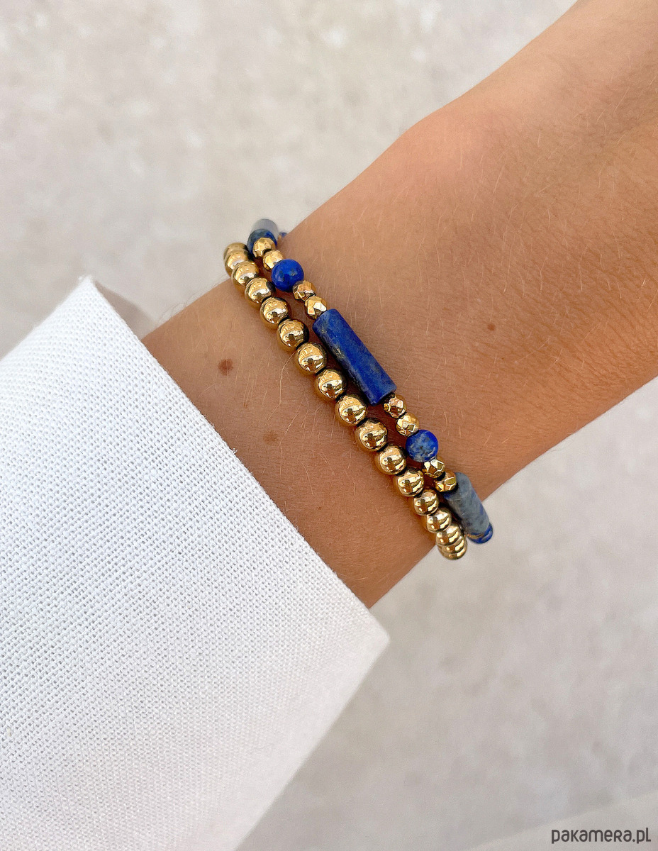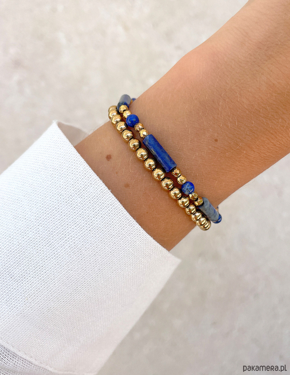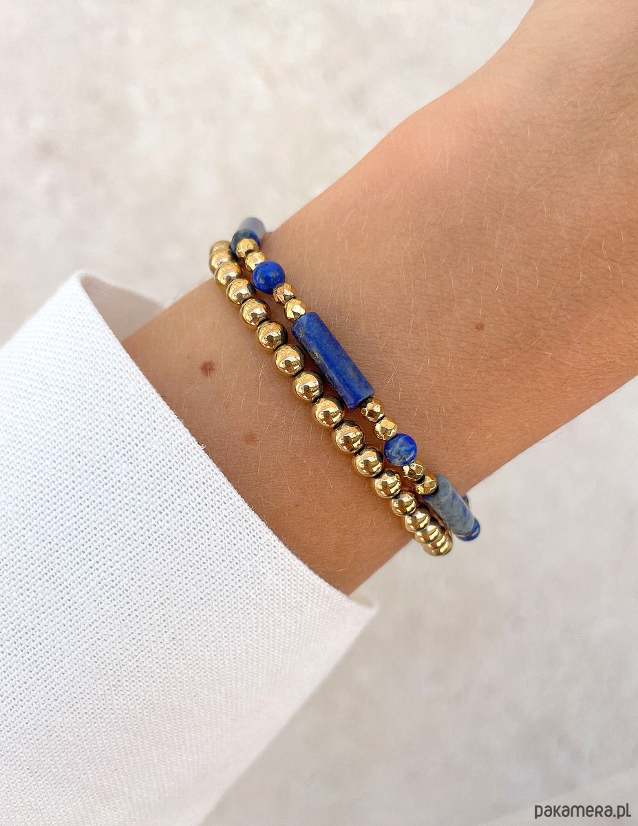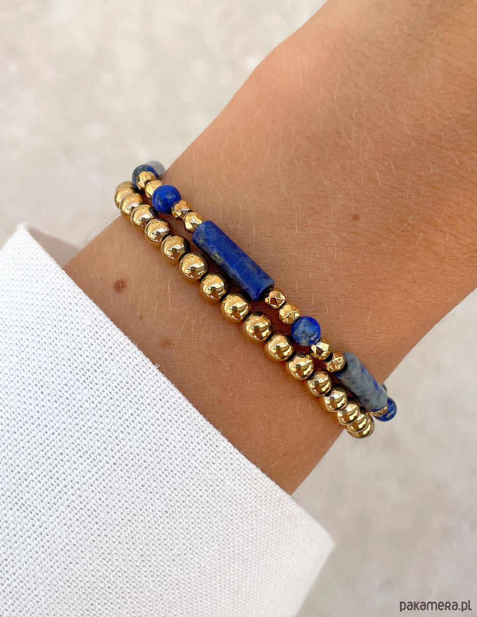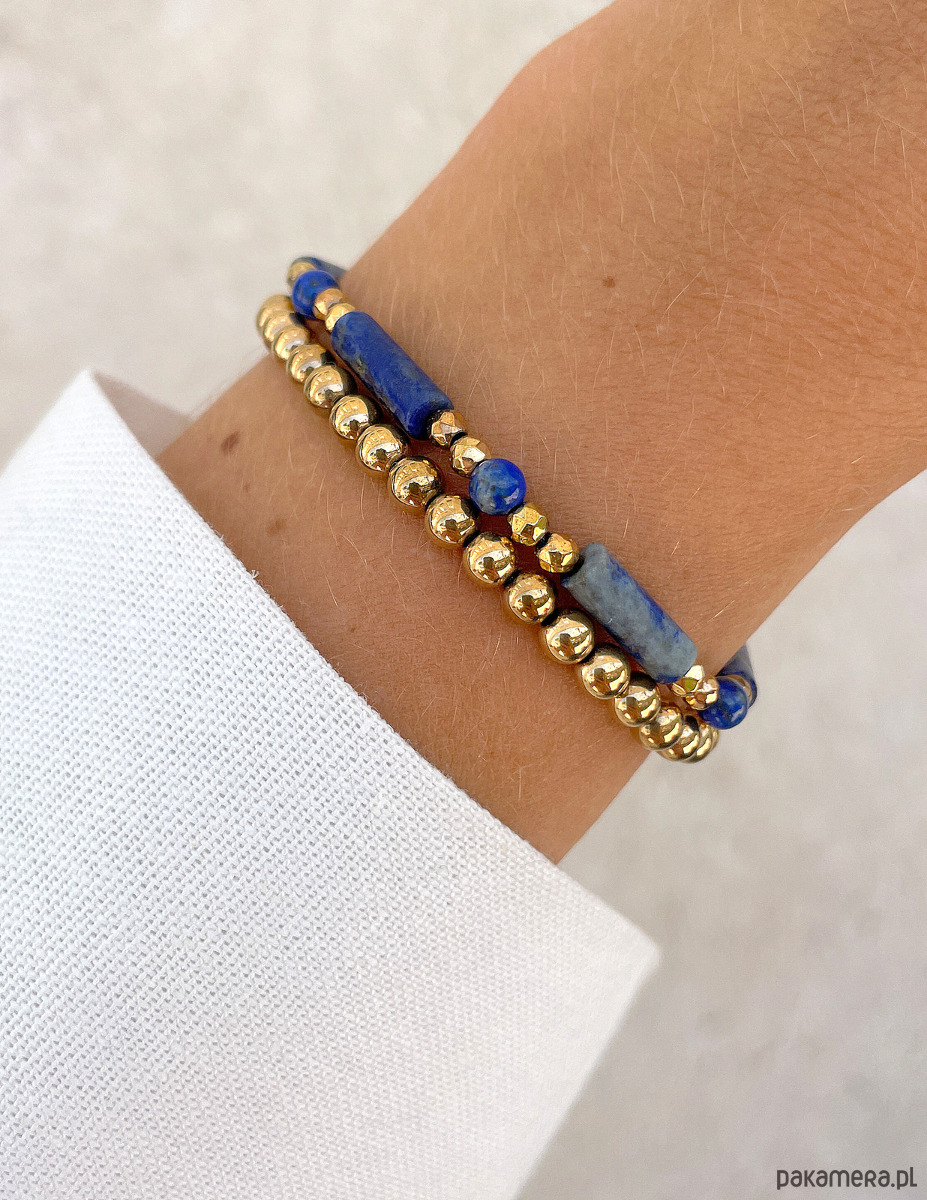Zestaw składa się z dwóch bransoletek. Pierwsza została w całości wykonana z gładkich kuleczek hematytu w kolorze złotym o średnicy około 4 mm. Druga bransoletka to harmonijne połączenie lapis lazuli w kształcie gładkich kulek o średnicy około 4 mm i fasetowanej belki o wymiarach około 3 x 13 mm. Uzupełnieniem są lśniące, fasetowane kuleczki hematytu w kolorze złotym o średnicy około 3 mm, które nadają całości wyrafinowanego i nowoczesnego charakteru. Kamienie lapis lazuli zachwycają niepowtarzalnymi ciemnoniebieskimi odcieniami z wtrąceniami, co sprawia, że każdy kamień jest jedyny w swoim rodzaju. Dzięki wykorzystaniu wytrzymałej, elastycznej żyłki jubilerskiej, bransoletki są nie tylko piękne, ale także niezwykle komfortowe w noszeniu.
