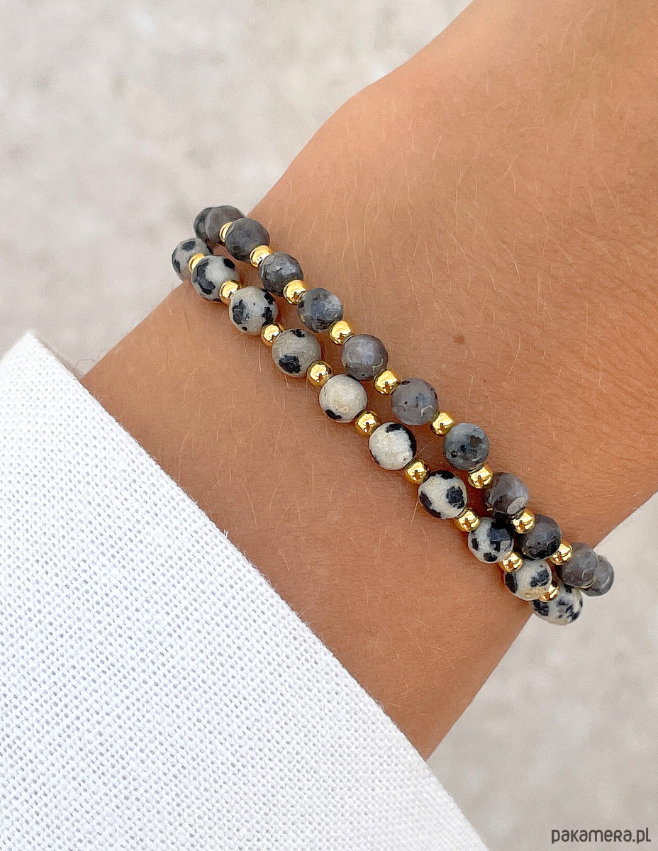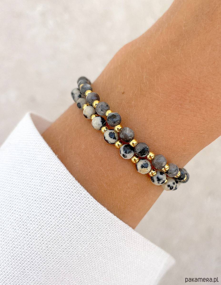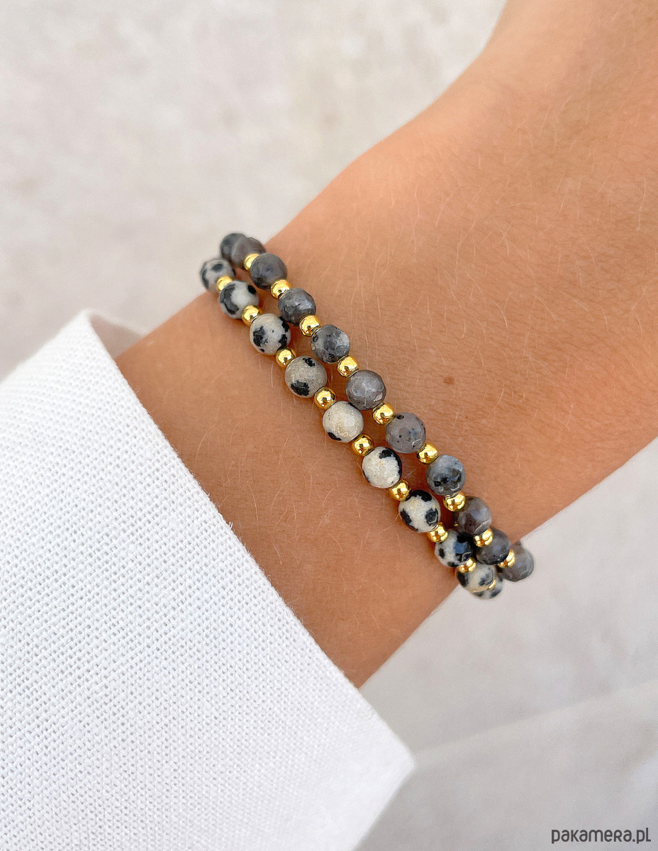 Pierwsza bransoletka to subtelna kompozycja fasetowanych kulek jaspisu dalmatyńskiego (ok. 4 mm), które zachwycają unikalnym połączeniem bieli z czarnymi plamkami. Całości dopełniają gładkie, złote kuleczki hematytu (ok. 3 mm). Druga bransoletka łączy szlachetne odcienie szarości fasetowanych kulek larvikitu (ok. 4 mm) z minimalistycznym blaskiem złotego hematytu (ok. 3 mm).