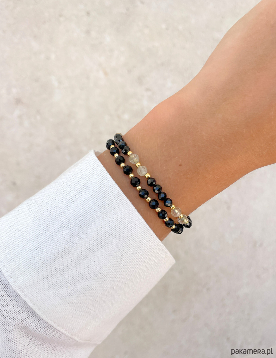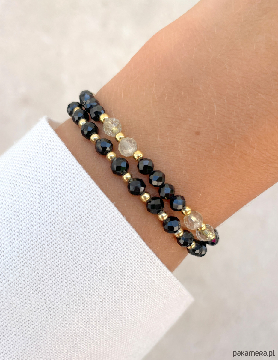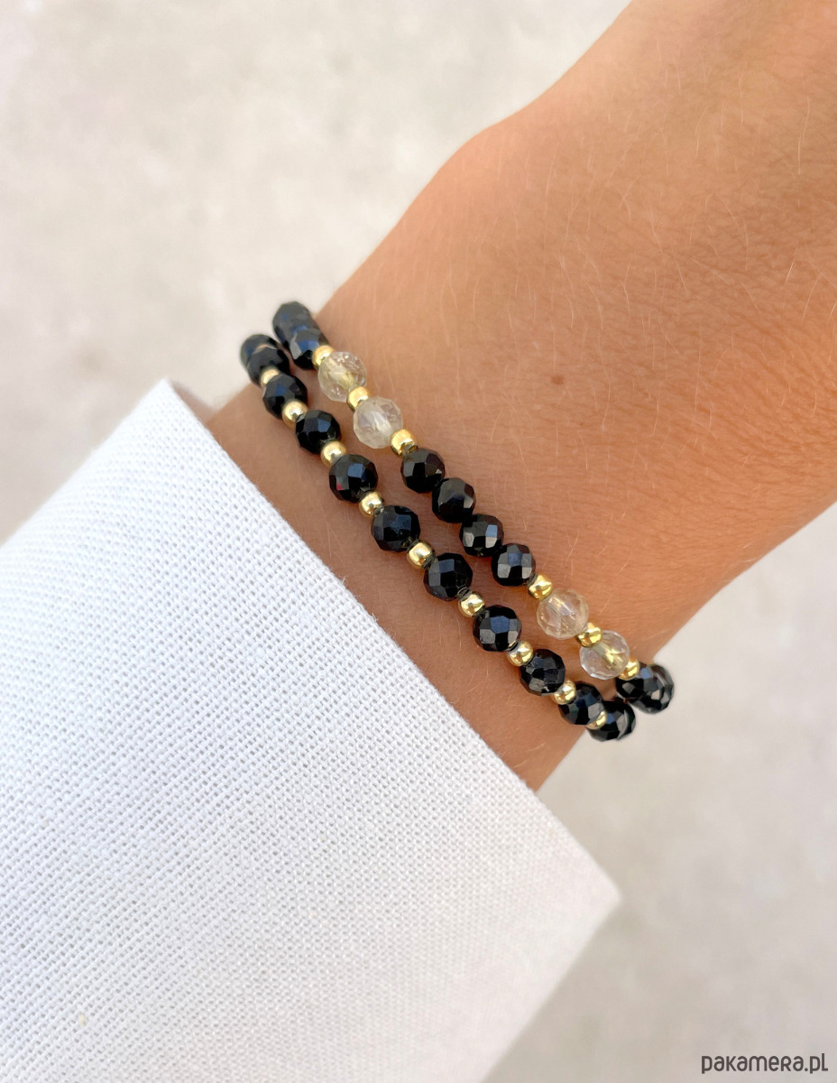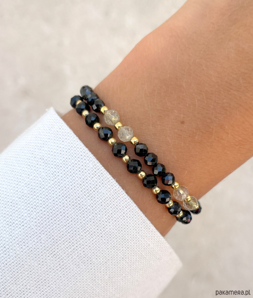 Druga bransoletka to harmonijna mieszanka fasetowanych kulek czarnego turmalinu i słonecznego cytrynu (ok. 4 mm), połączonych ze złotymi kulkami hematytu (ok. 3 mm). Cytryn to kamień dobrobytu, który przyciąga do życia obfitość i pozytywną energię. Wierzy się również, że wspiera pewność siebie i pomaga w podejmowaniu ważnych decyzji.