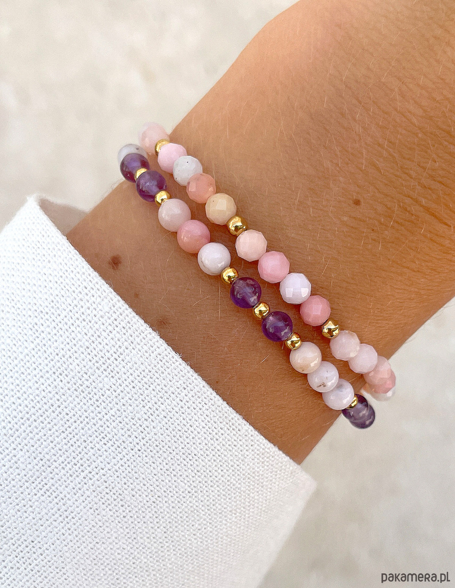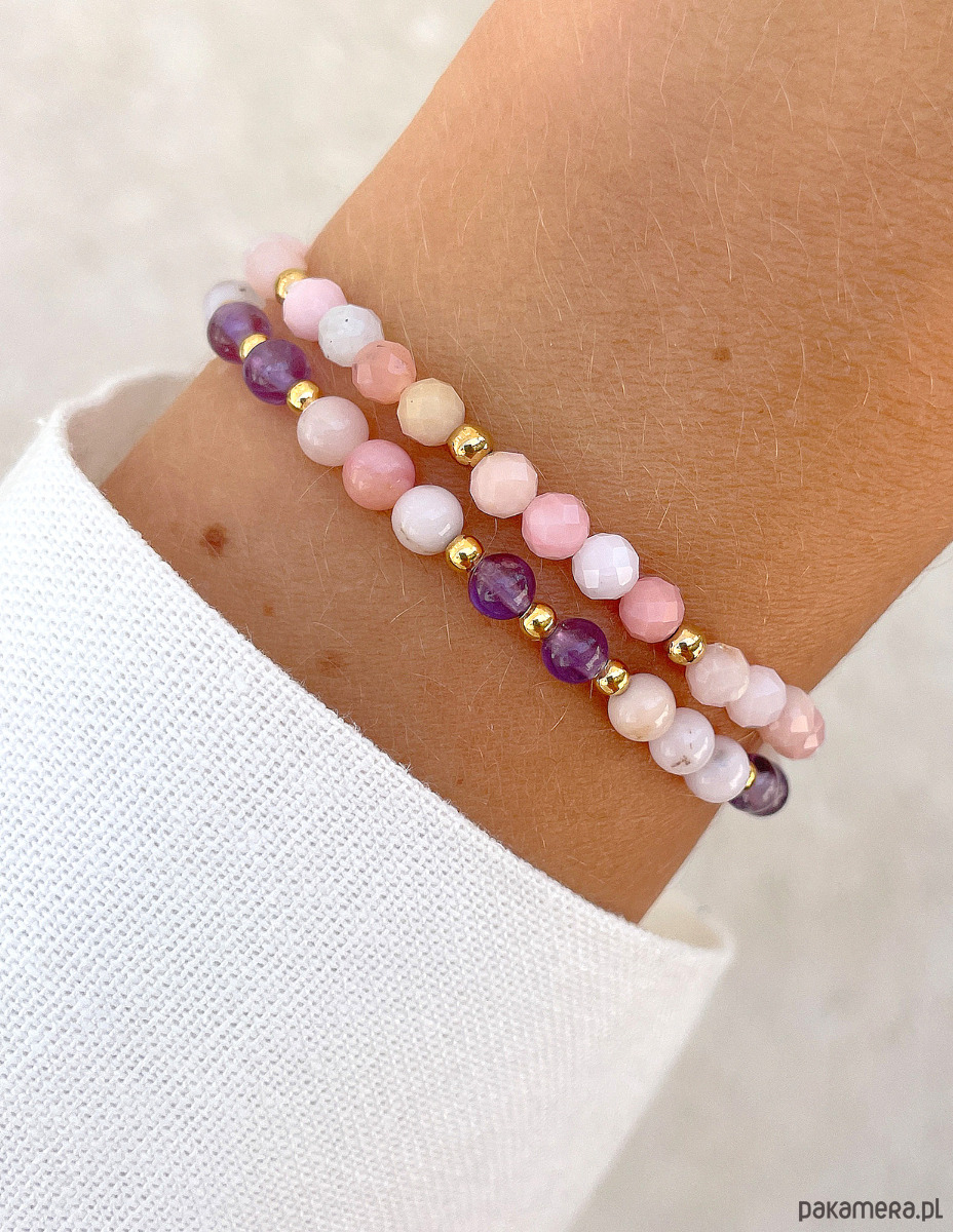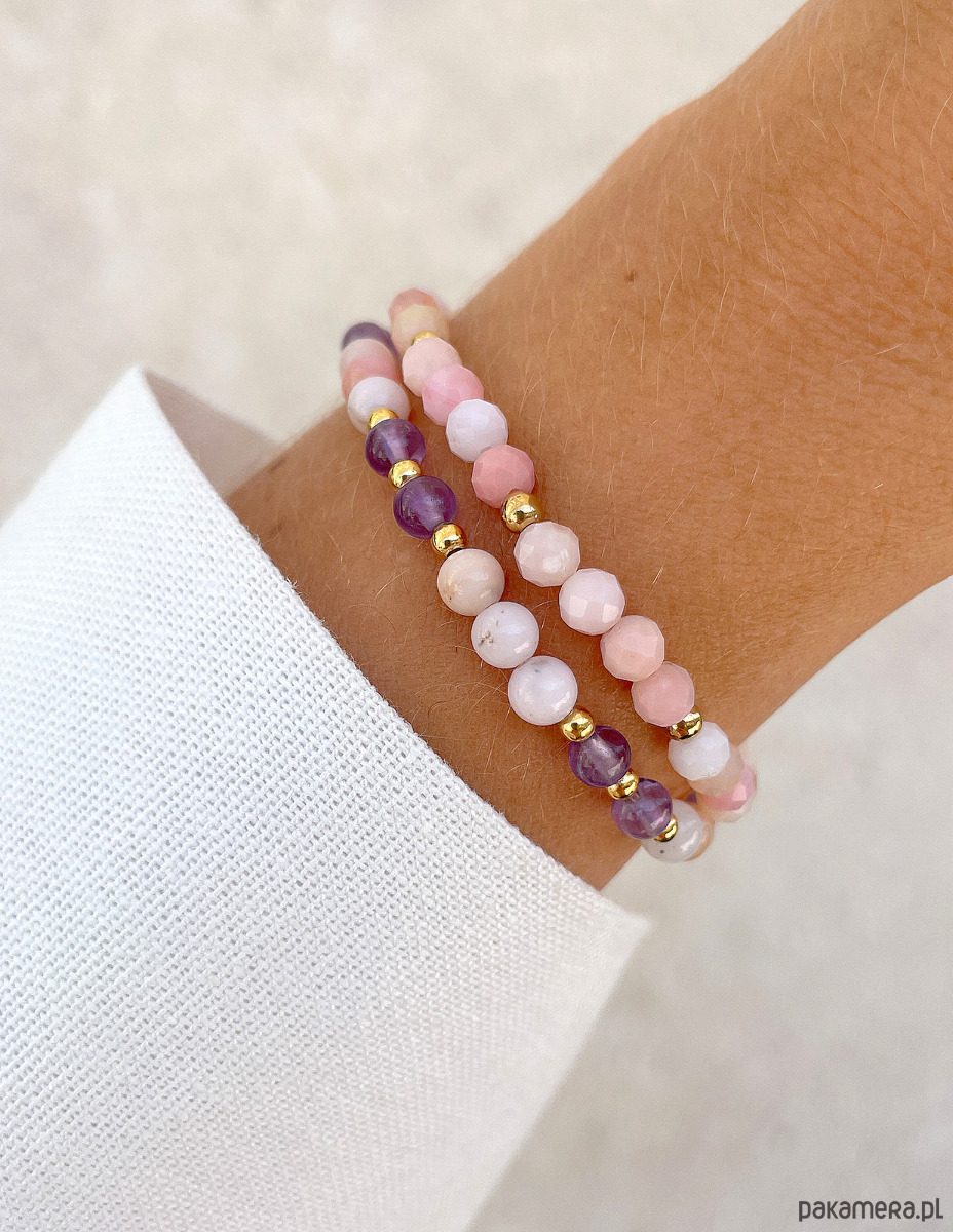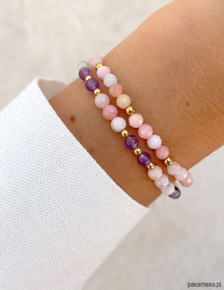 Pierwsza z bransoletek to subtelne połączenie fasetowanych, różowych kulek opalu (ok. 4 mm) z gładkimi, złotymi kuleczkami hematytu (ok. 3 mm). Druga bransoletka to harmonijna kompozycja gładkich kulek ametystu (ok. 4 mm) w głębokim, fioletowym odcieniu, które przeplatają się z różowymi, gładkimi kulkami opalu (ok. 4 mm) oraz złotym hematytem (ok. 3 mm).