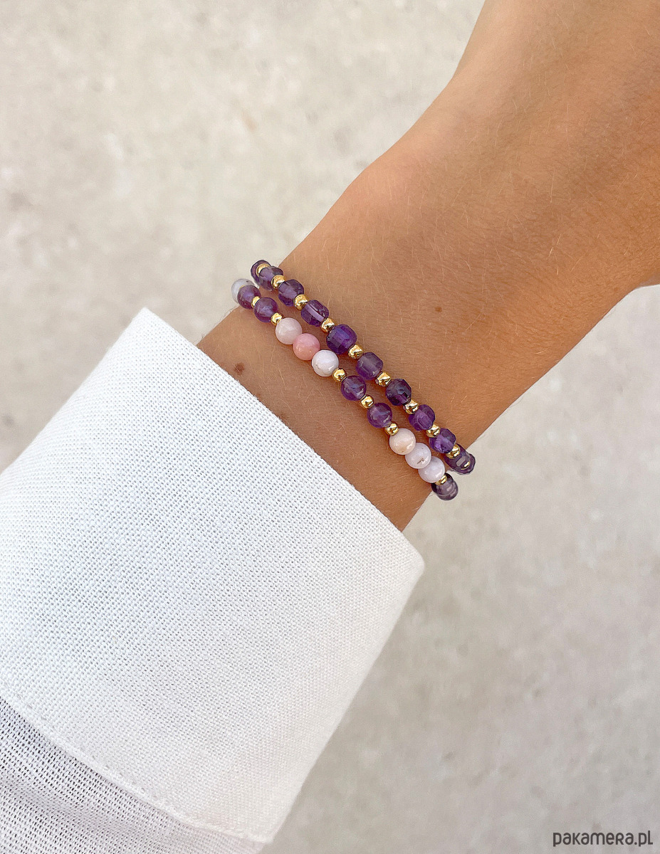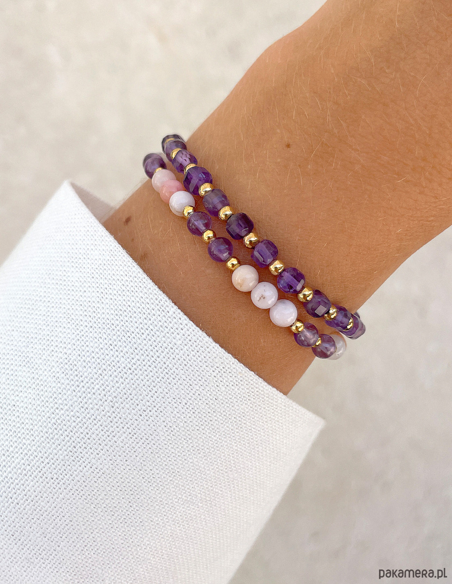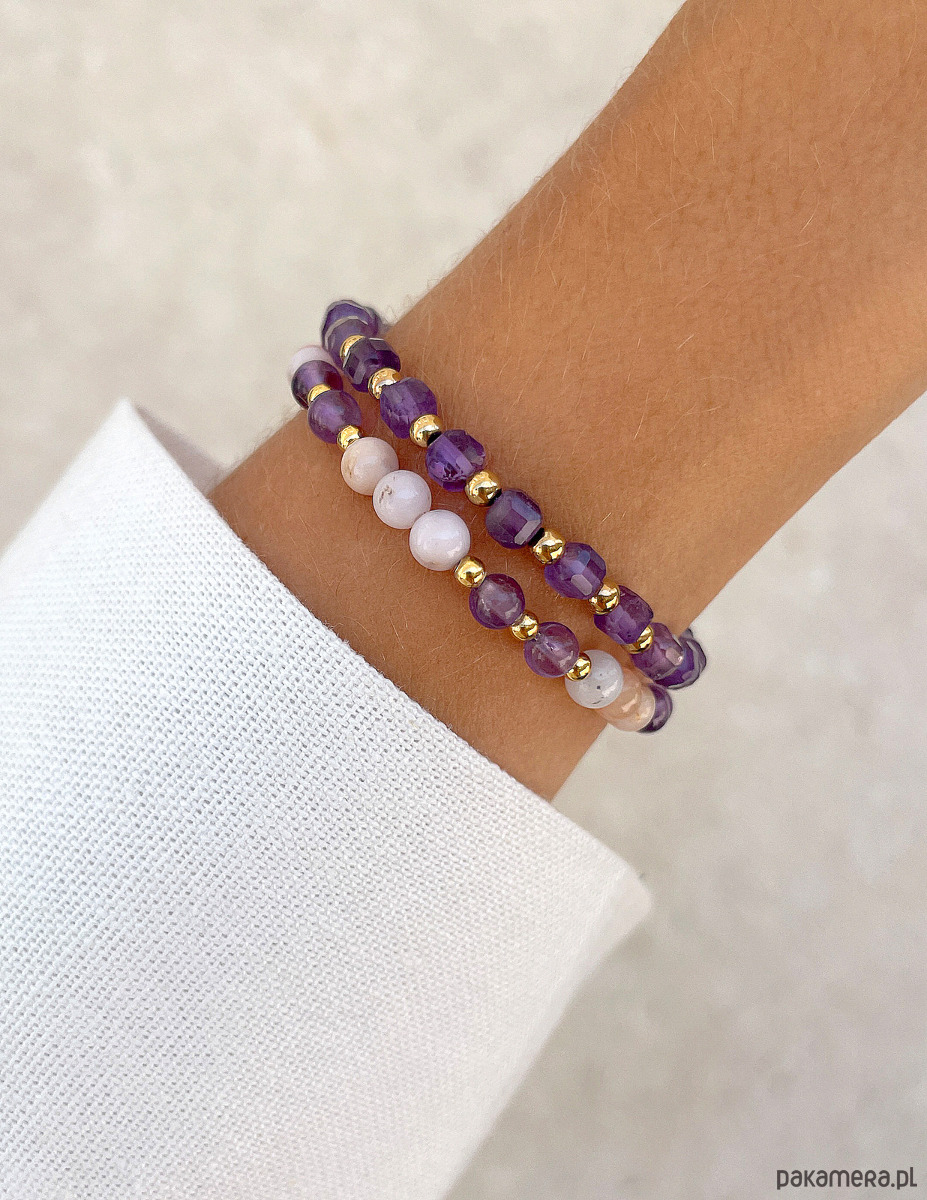 Pierwsza z bransoletek to minimalistyczna kompozycja z fasetowanych kostek ametystu (ok. 4 mm), które przeplatają się z gładkimi, złotymi kuleczkami hematytu (ok. 3 mm). Druga bransoletka to harmonijna mieszanka gładkich kulek opalu (ok. 4 mm) w subtelnym, różowym odcieniu oraz gładkich kulek ametystu (ok. 4 mm), połączonych ze złotym hematytem (ok. 3 mm).