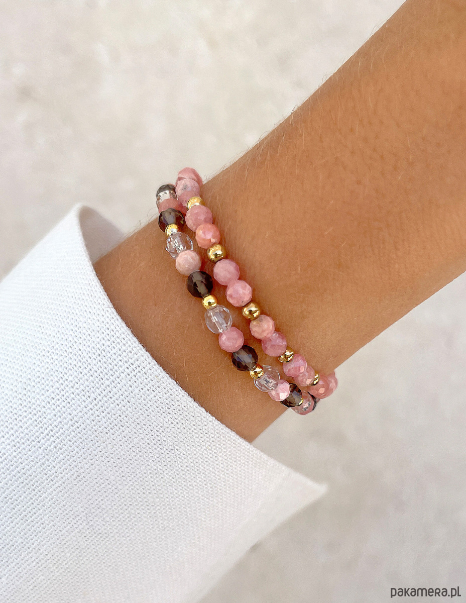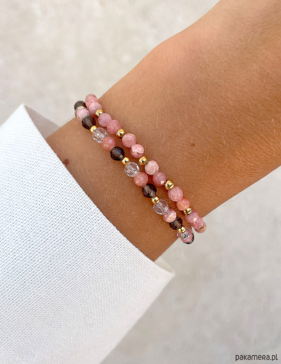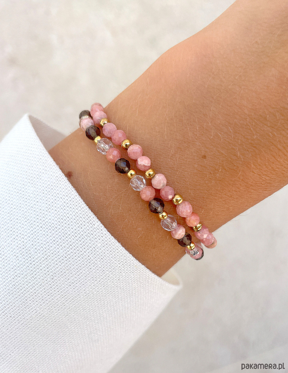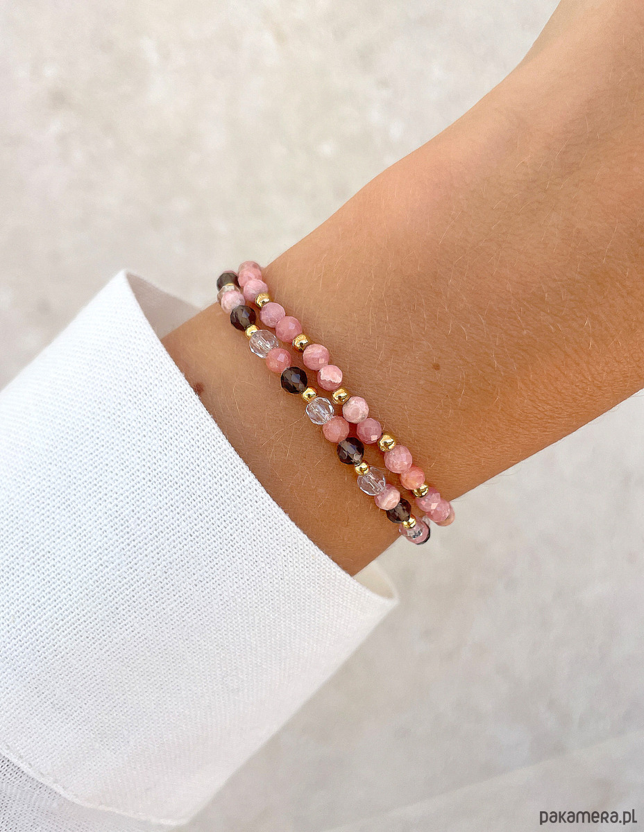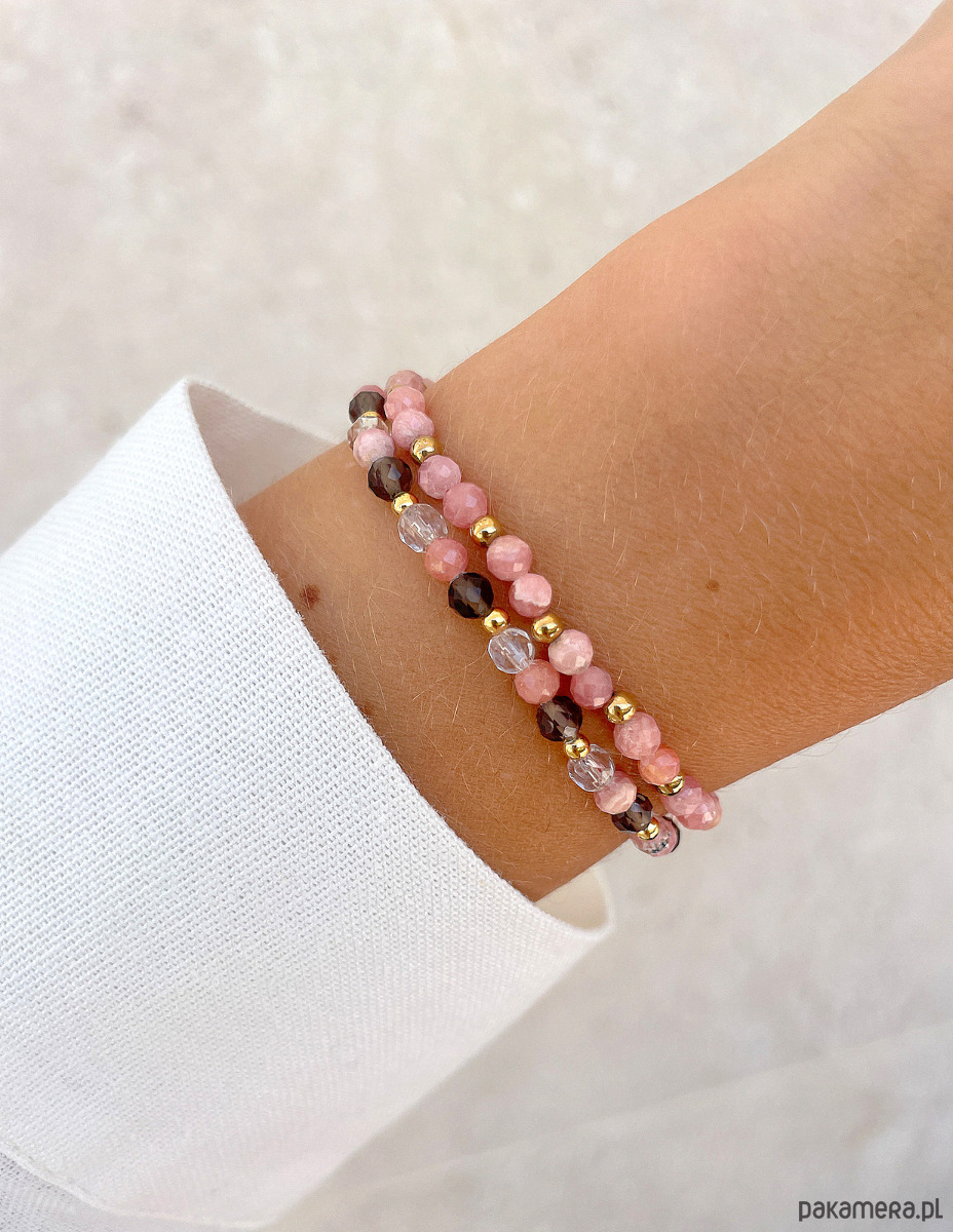 Pierwsza bransoletka to delikatna kompozycja fasetowanych kulek rodochrozytu (ok. 4 mm) w uroczym, różowym odcieniu, które przeplatają się z gładkimi, złotymi kuleczkami hematytu (ok. 3 mm). Druga bransoletka to harmonijna mieszanka fasetowanych kulek kwarcu dymnego (ok. 4 mm) o głębokim, brązowym kolorze, fasetowanych kulek rodochrozytu (ok. 4 mm) oraz kryształu górskiego (ok. 4 mm) o przezroczystej barwie. Całość dopełnia złoty hematyt (ok. 3 mm).