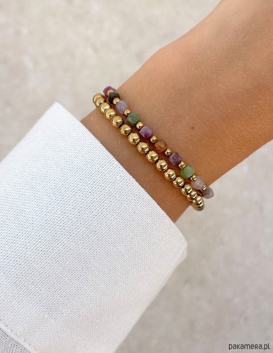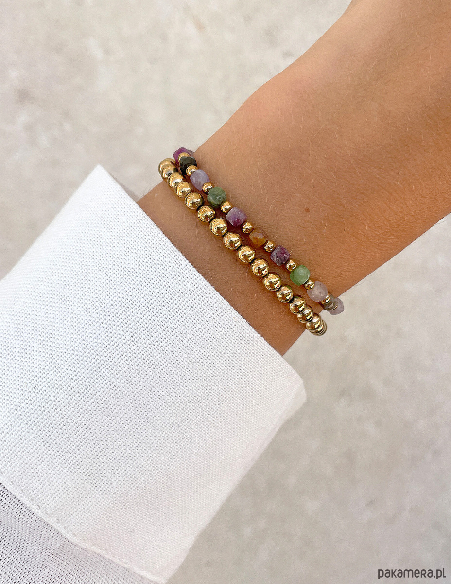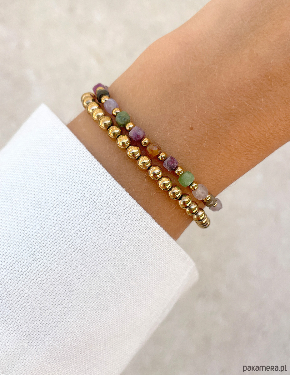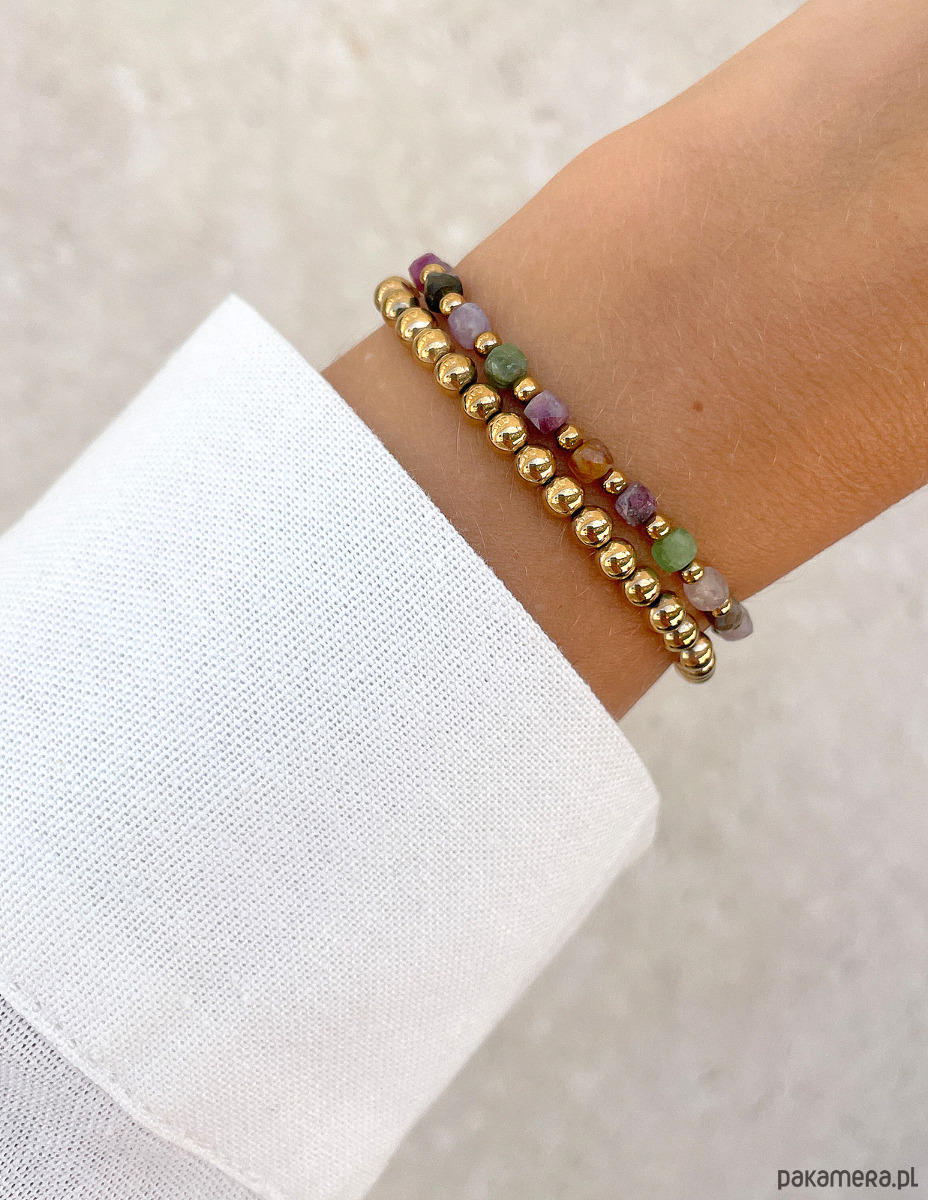 Zestaw składa się z dwóch bransoletek. Pierwsza została w całości wykonana z gładkich, złotych kuleczek hematytu o średnicy około 4 mm. Druga bransoletka to harmonijne połączenie wielobarwnych, fasetowanych kostek turmalinu o wymiarach około 4 mm oraz mniejszych, gładkich kuleczek hematytu w kolorze złotym o średnicy około 2,5 mm. Dzięki wykorzystaniu wytrzymałej, elastycznej żyłki jubilerskiej, bransoletki są nie tylko piękne, ale także niezwykle komfortowe w noszeniu.