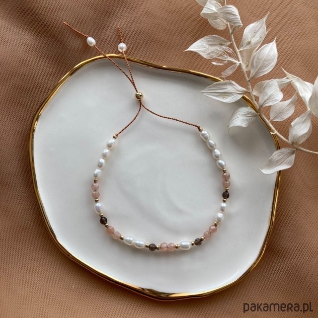 Wykonana z pereł, kamieni słonecznych oraz kwarcu dymnego. Złote elementy zostały stworzone w technologii Gold Filled. Jest to materiał trwały, mniej podatny na starcie niż srebro pozłacane (Gold Plated).