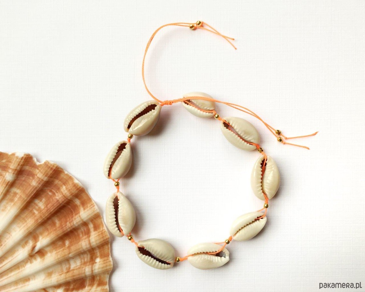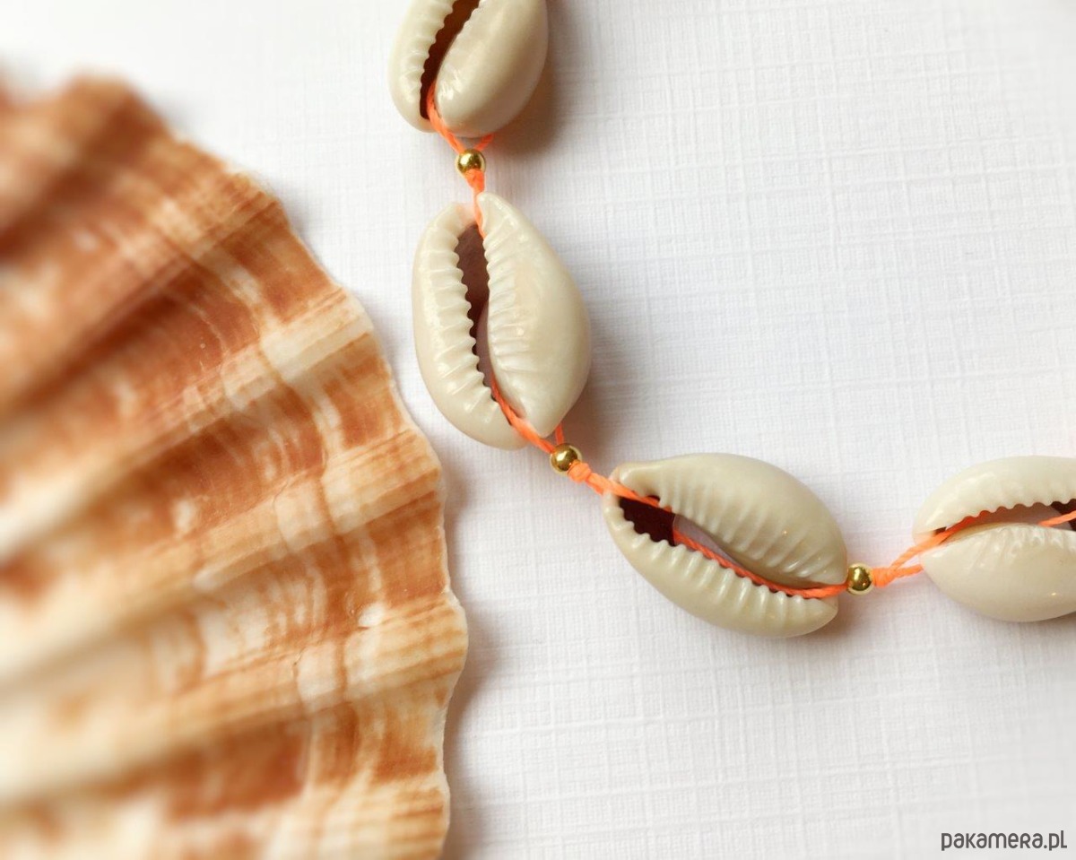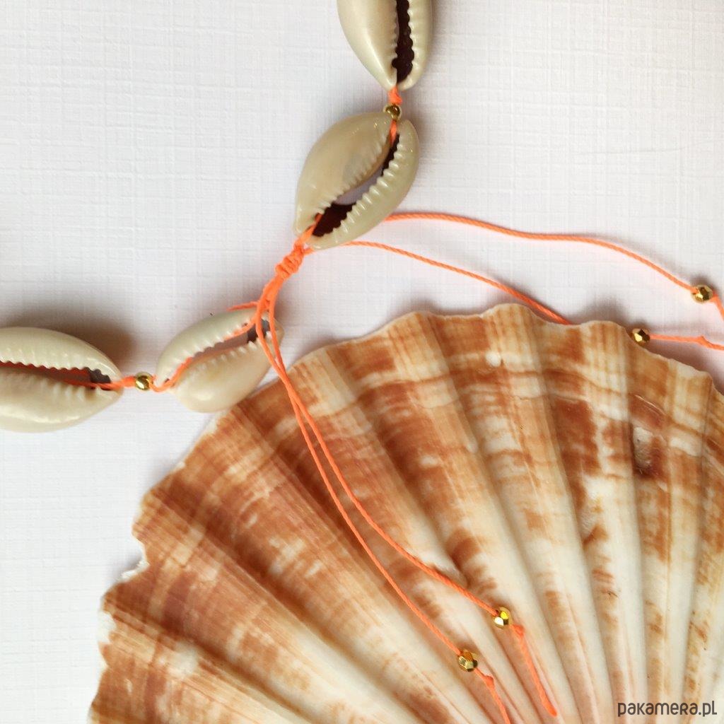 Bransoletka wykonana z muszli kauri mocowanych na neonowym bardzo trwałym sznureczku.