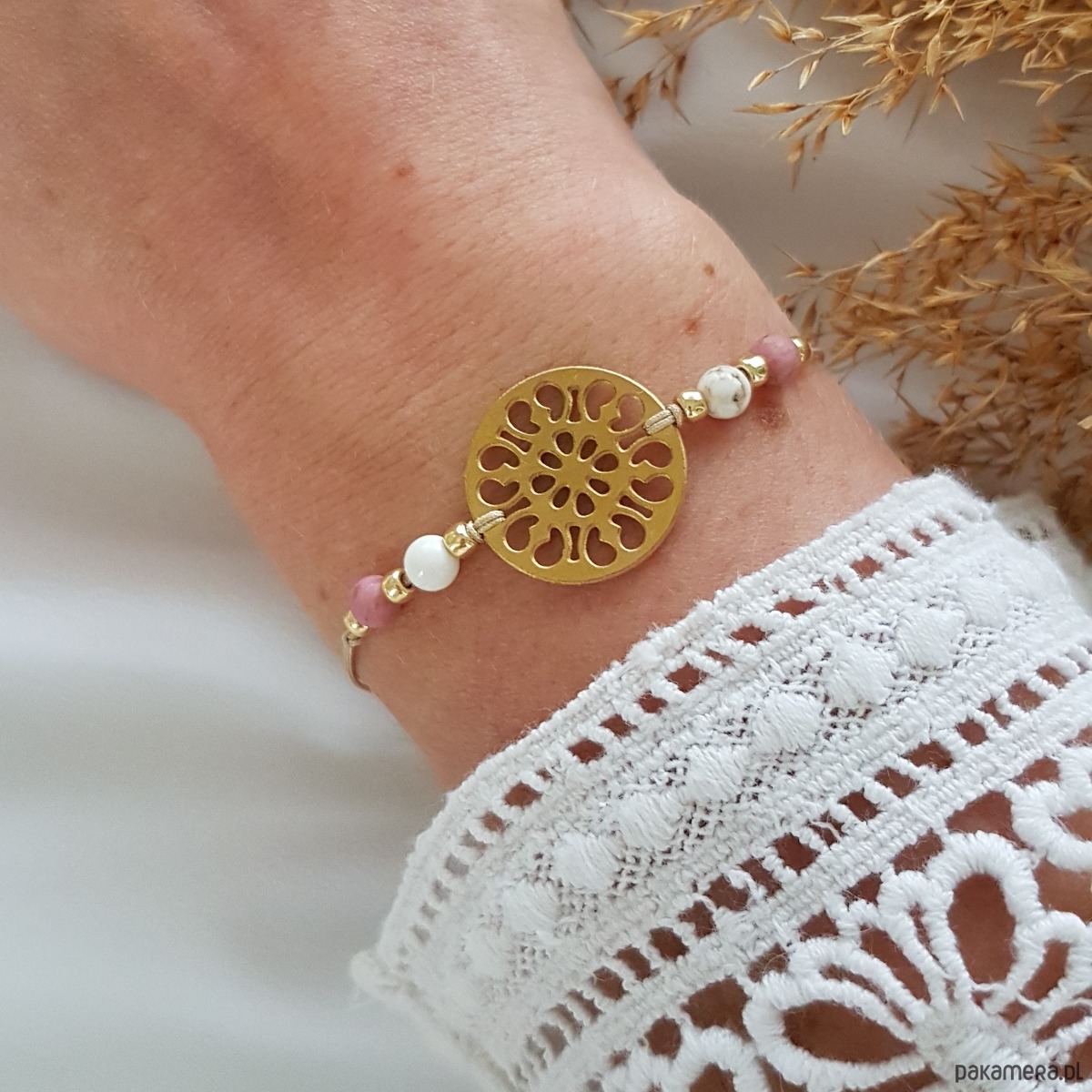 Bransoletka z rozetą ze stali szlachetnej w otoczeniu kamieni naturalnych (rodonitu i howlitu) oraz koralików ze szkła japońskiego w kolorze złotym. Regulowane zapięcie pozwala na dowolne dopasowanie do nadgarstka.