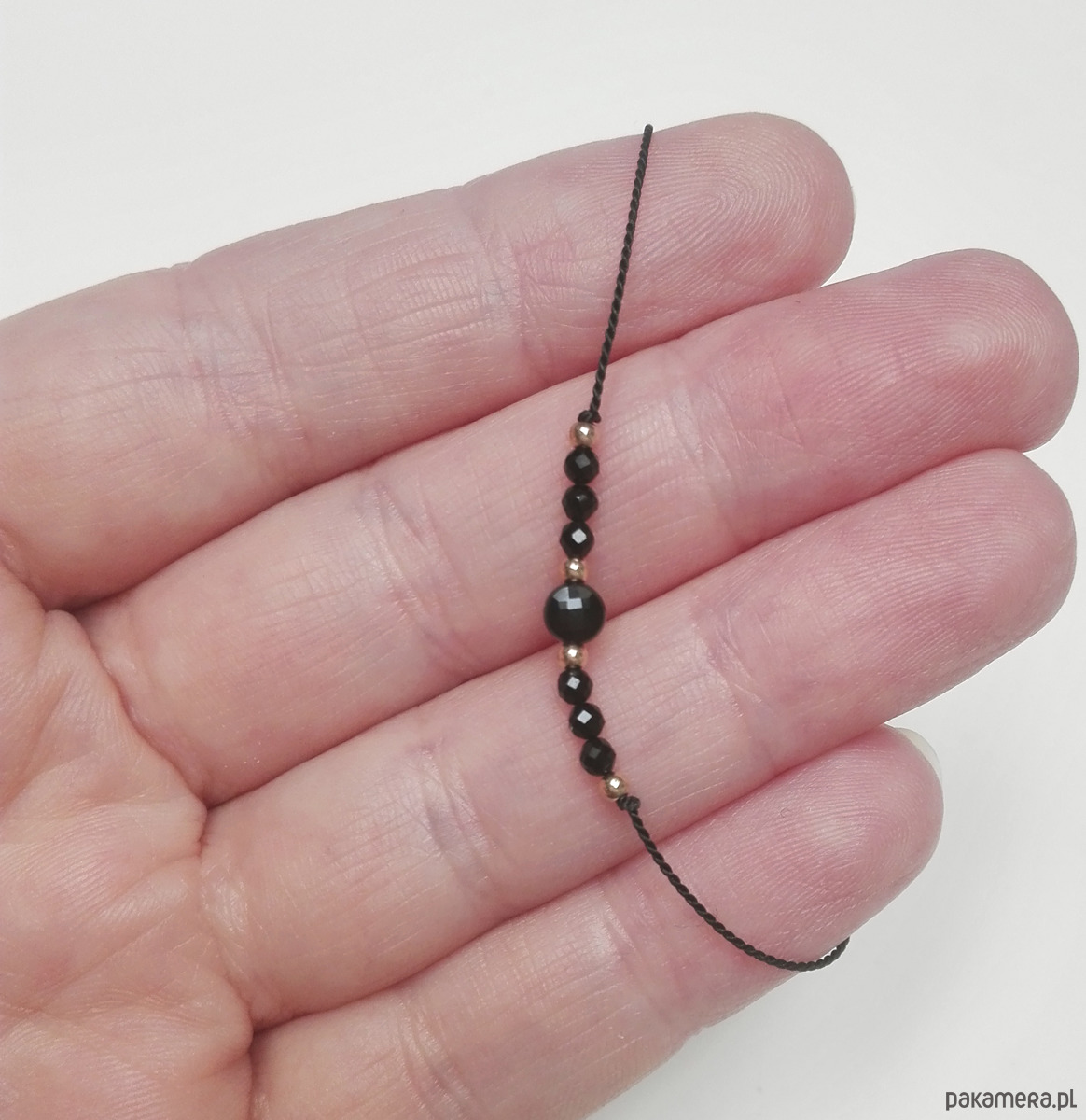 Błyszczące kamyki (2mm i 3x2mm) i są starannie osadzone na szarym, jedwabnym sznureczku i rozświetlone srebrnymi (925) lub pozłacanymi w technologii gold filled (14 K) kuleczkami. Zapięcie w formie malutkiego stopera z silikonem wewnątrz.
