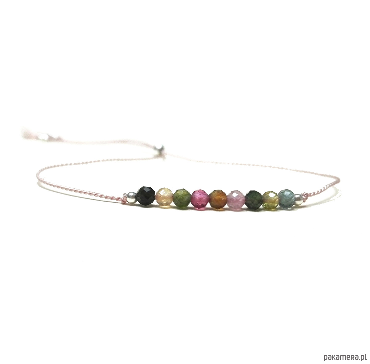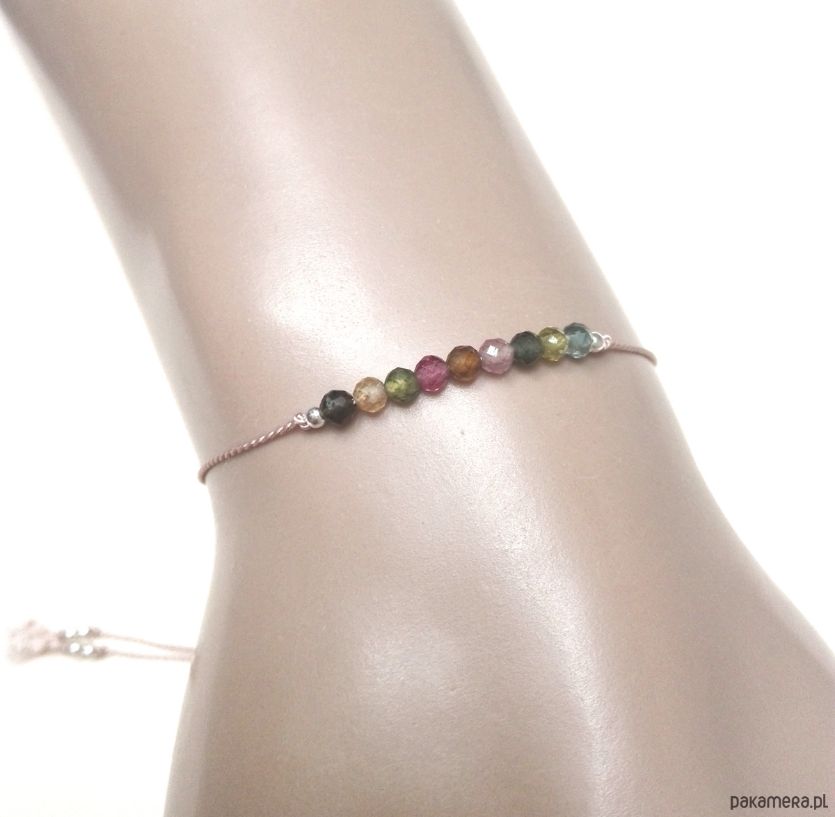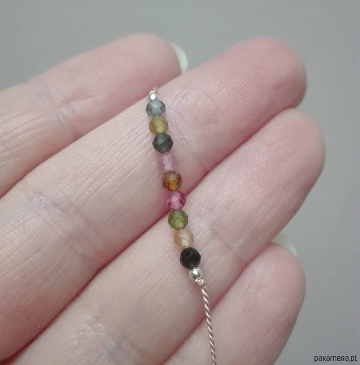Delikatna i bardzo lekka, minimalistyczna bransoletka z naturalnego kolorowego turmalinu (fasetowane koraliki ok. 2.5 mm) idealna do noszenia samodzielnie lub z innymi ulubionymi.
