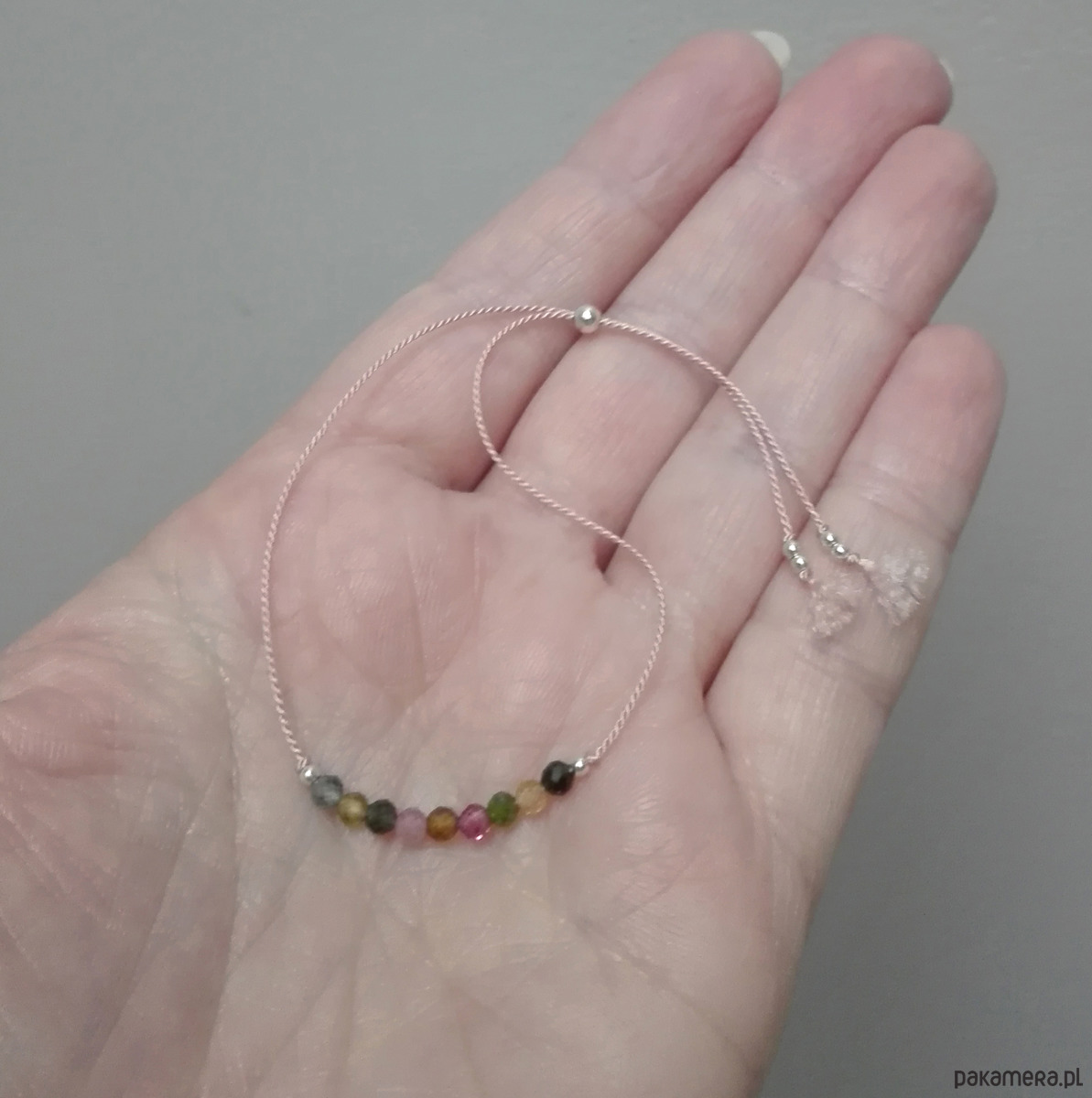 Błyszczące kamyki są starannie osadzone na jasnoróżowym (cielistym), jedwabnym sznurku i uzupełnione wykończeniem ze srebra.