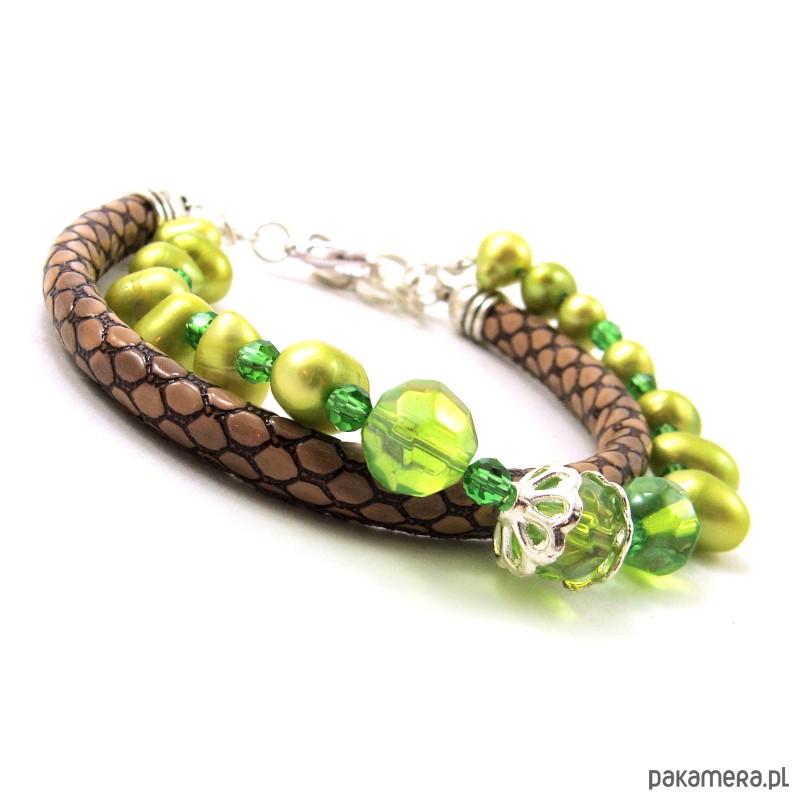 Bransoletka wykonana z grubego rzemienia , pereł hodowlanych, szklanych kryształów, elementów srebrzonych. Odpowiednia na nadgarstek o obwodzie: 19- 21 cm. Jeżeli interesuje Państwa inna długość bransoletki proszę o kontakt przed dokonaniem zakupu.