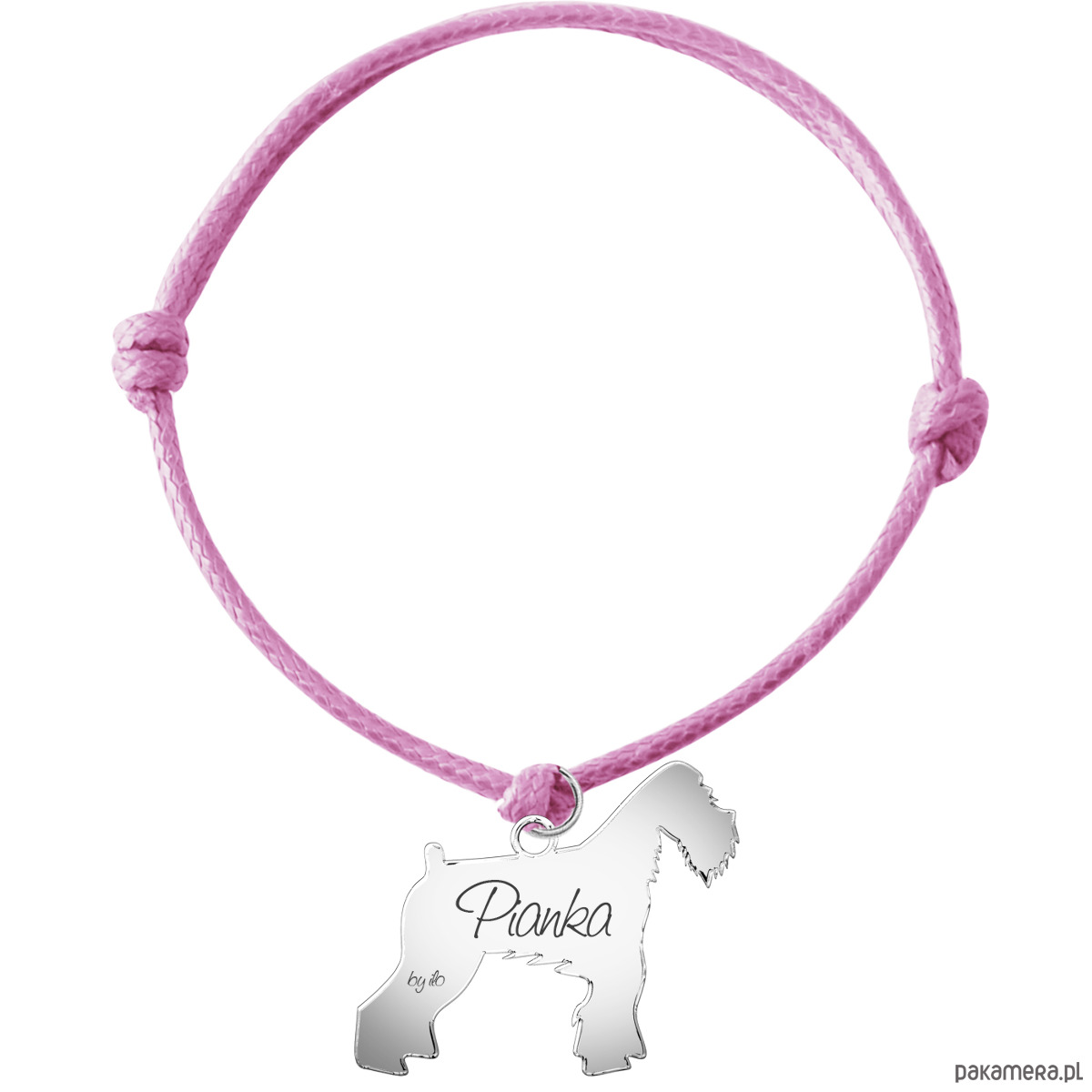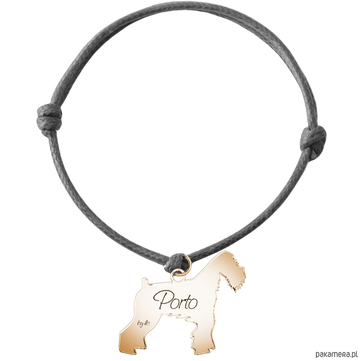 Opis: Bransoletka sznurkowa z zawieszką w kształcie SZNAUCER , w wersji srebrnej lub pozłacanej, regulowana za pomocą supełków
