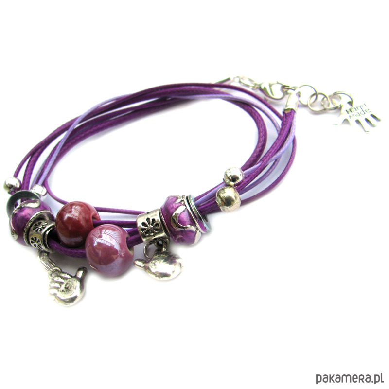 Bransoletka wykonana z 3 plecionych i woskowanych sznurków jubilerskich bardzo dobrej jakości, korali ceramicznych, przekładek modułowych, malowanych oraz dowieszek w kształcie dłoni. Do 2-krotnego owinięcia wokół nadgarstka. Długość 40 cm (w tym 2,5 cm łańcuszka do regulacji) plus dowieszka, pasuje na nadgarstek 15-18 cm. Zapięcie typu karabińczyk.