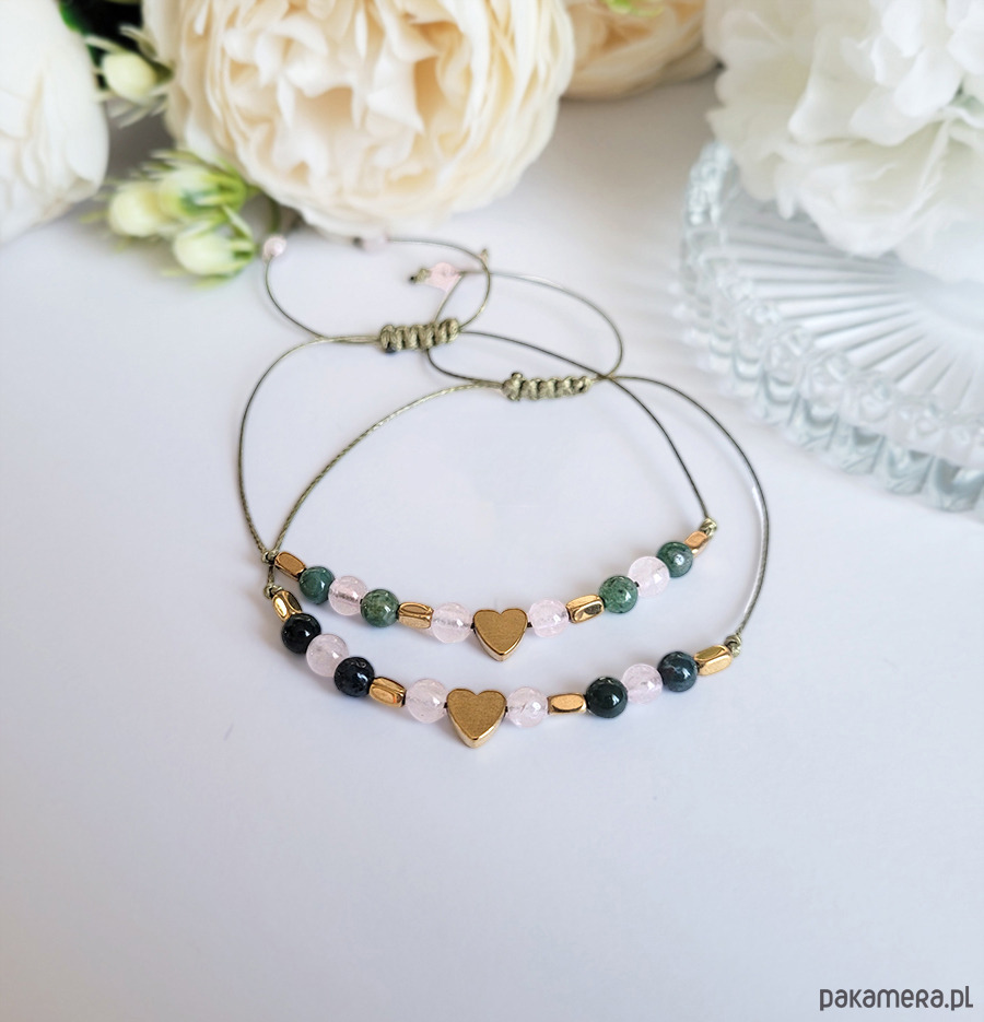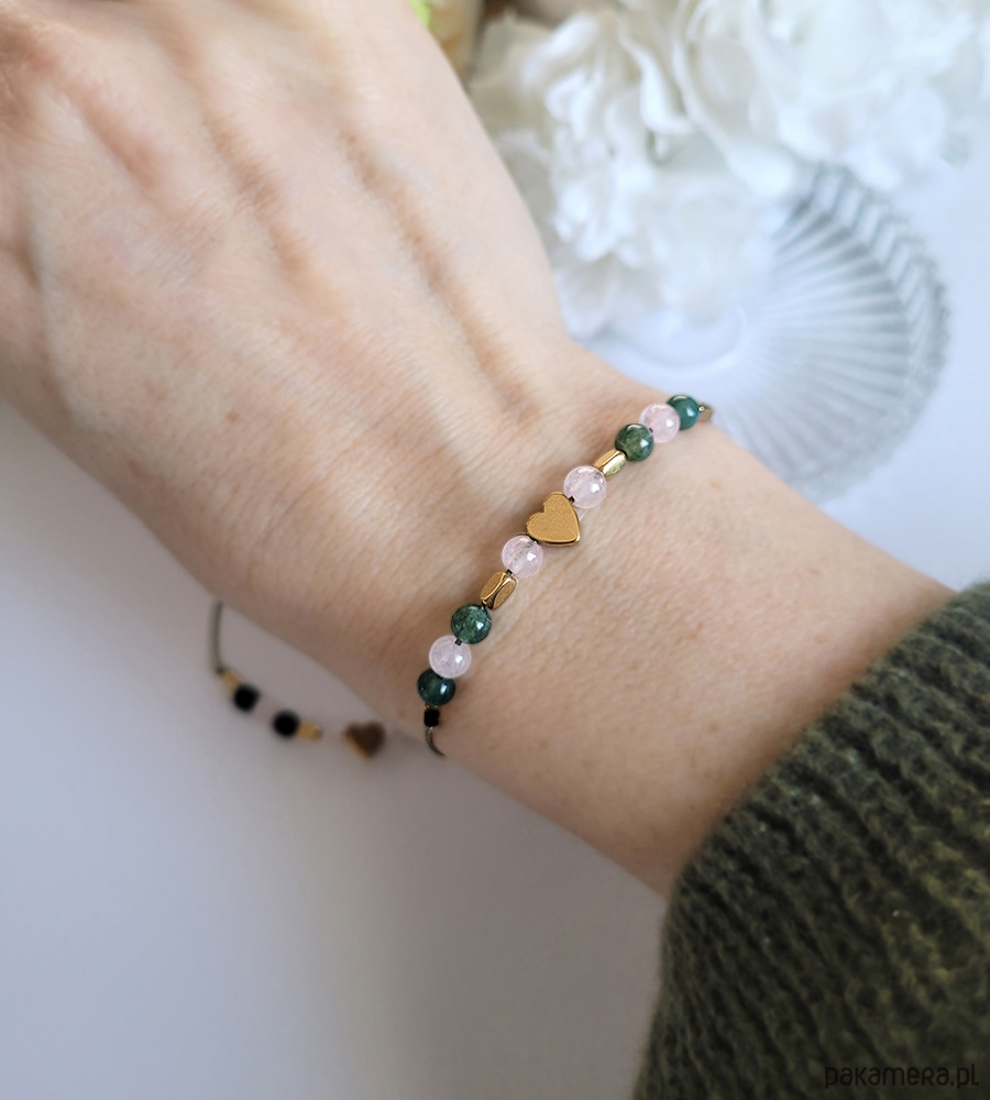 Bransoletka przyjaźni zrobiona z kamieni naturalnych: Kwarcu różowego, Agatu mszystego oraz Hematytu w kolorze złota.