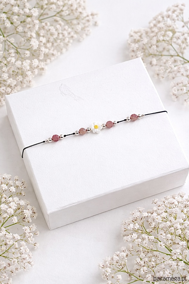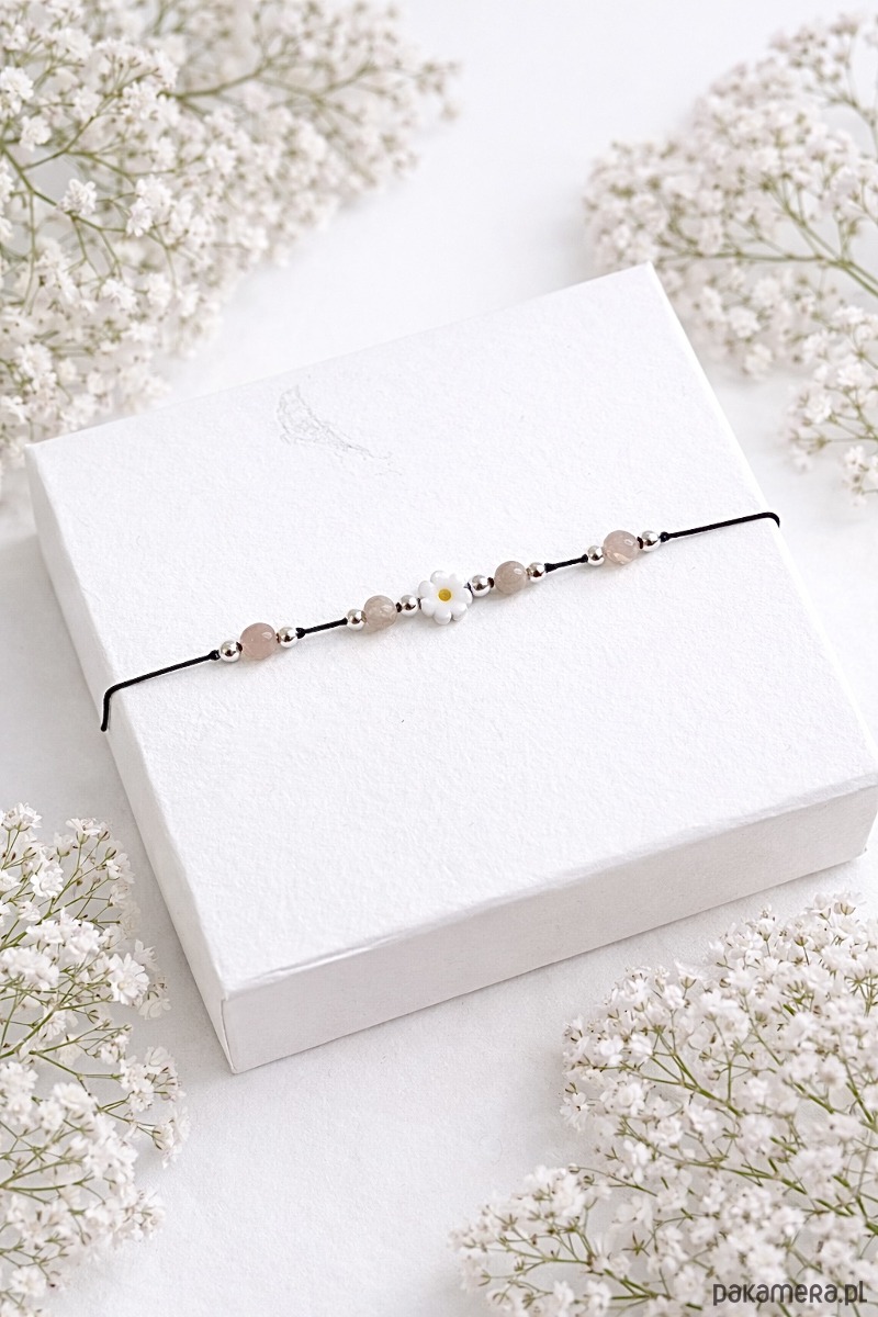Subtelna, minimalistyczna bransoletka na cienkim sznurku z drobnymi koralikami w odcieniach pudrowego różu i srebrnymi akcentami. W centrum – mała stokrotka, symbol świeżości, lekkości i nowego początku.