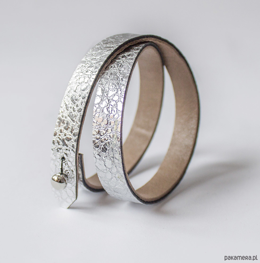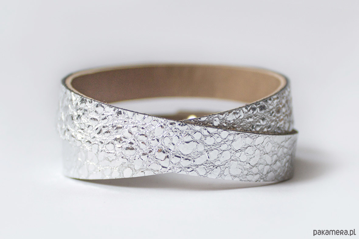 Wykonany przez nas ręcznie z najwyższej jakości skóry naturalnej w kolorach: fakturowanego, jasnego srebra, od spodu podklejony miękką, beżową skórką.