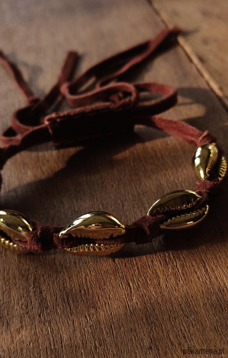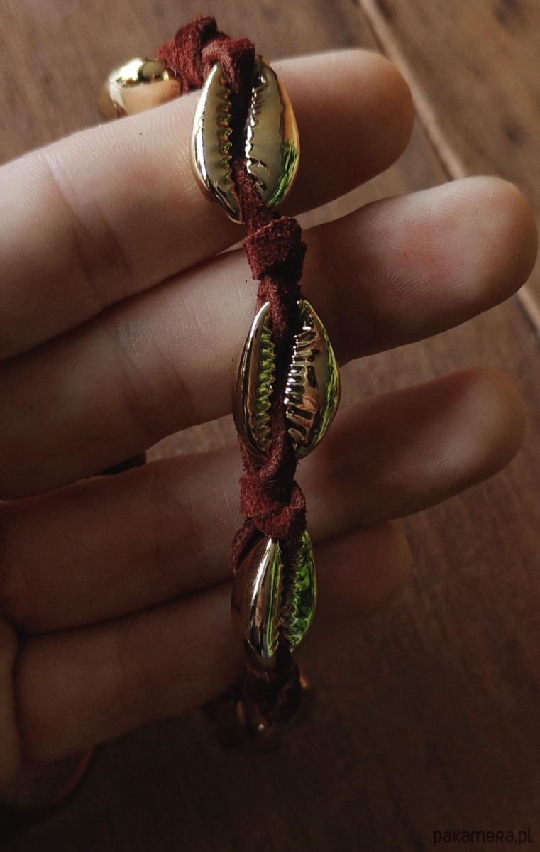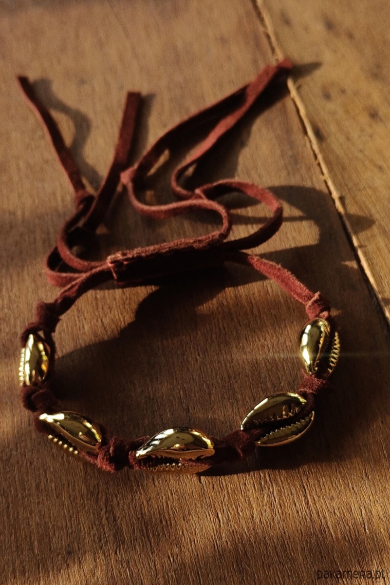 Bransoleta wykonana z naturalnej zamszowej skóry i naturalnej metalizowanej muszli.