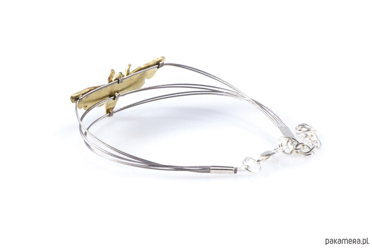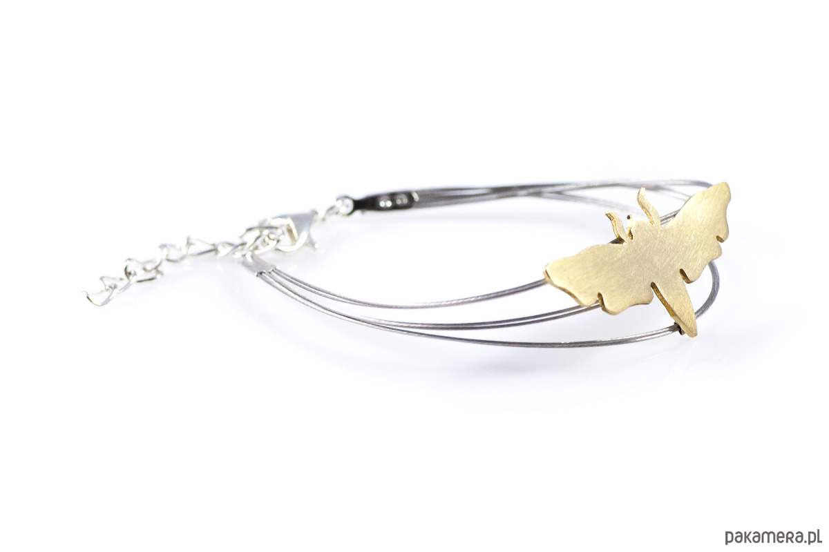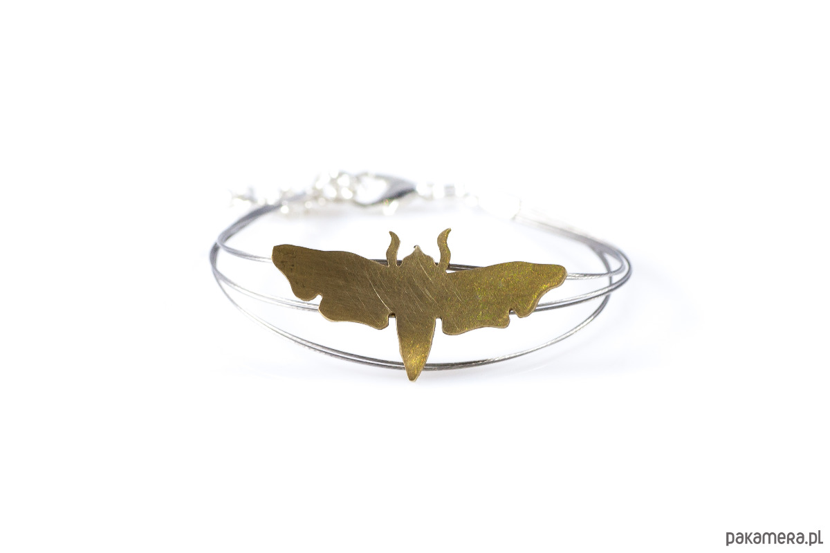 Elementy ręcznie wycinam z mosiądzu, następnie poleruję i matowię. Ćma wielkości około 2,5 cm, przymocowana do linek o długości około 14 cm. Przy zapięciu jest dołączony łańcuszek, umożliwiający indywidualne dopasowanie bransoletki do obwodu nadgarstka.