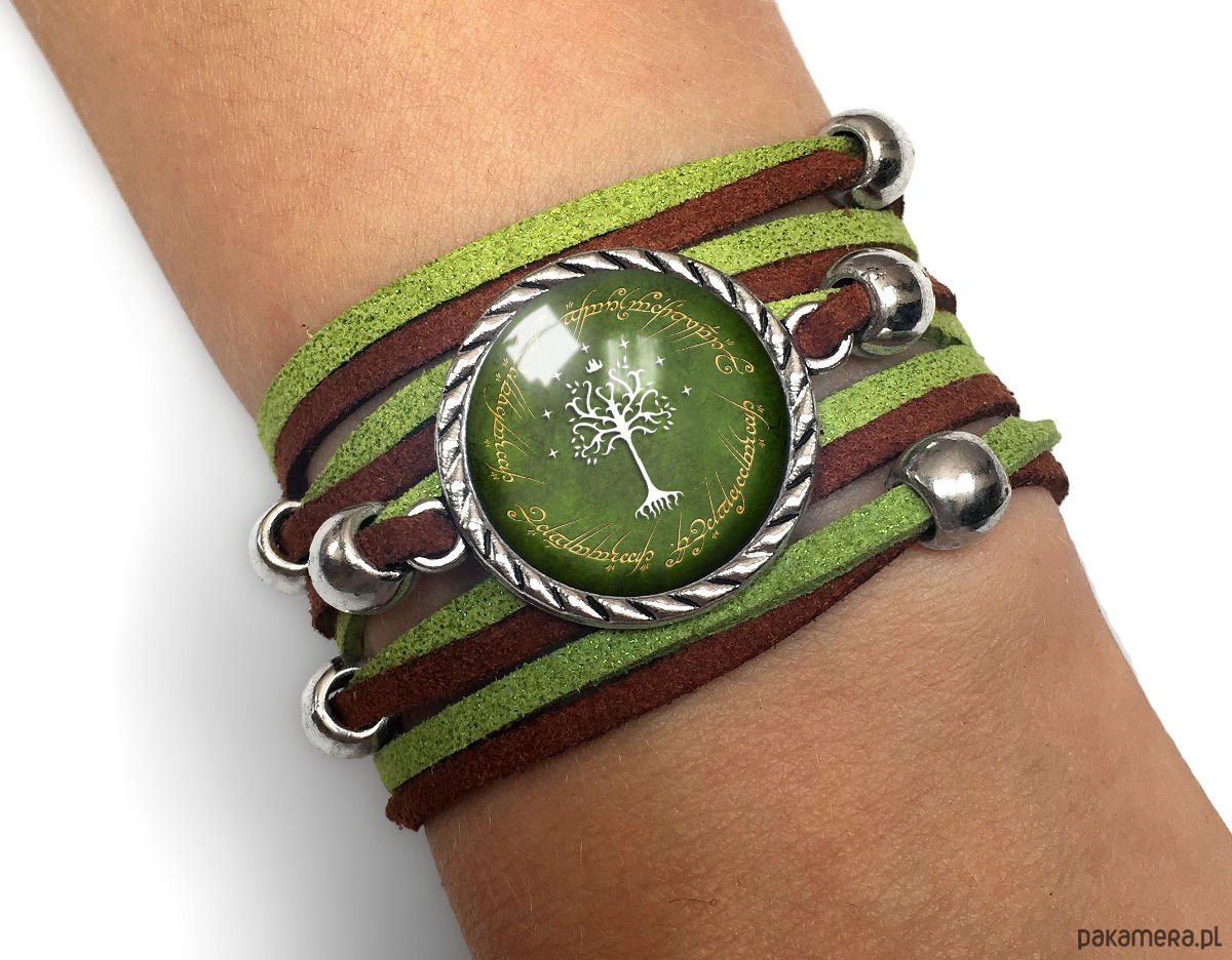 Ręcznie robiona zamszowa bransoletka, wielokrotnie zakręcana na ręku, z wysokiej jakości grafiką pokrytą wypukłym, powiększającym szkiełkiem.