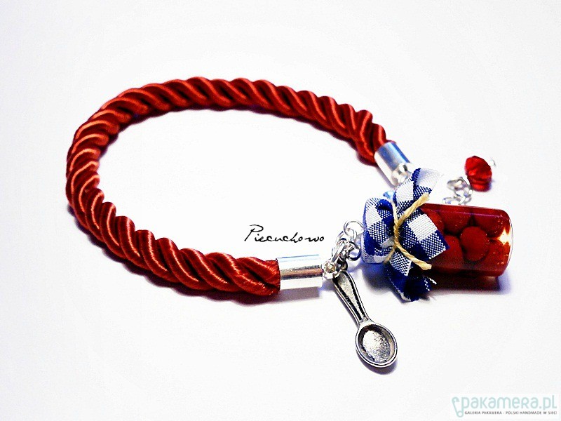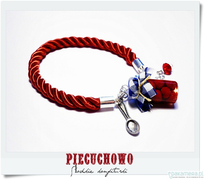 Witam serdecznie, przedmiotem sprzedaży jest bransoletka ze szklanym słoiczkiem ok 2 cm- w słoiczku wisienki. długość bransoletki ok- 16-17 cm , dodatkowo 6 cm przedłużki. Bransoletka sznurkowa - koloru czerwonego. Całość wykończona metalowymi dodatkami w kolorze srebrnym.Zapraszam ciepło Piecyk.