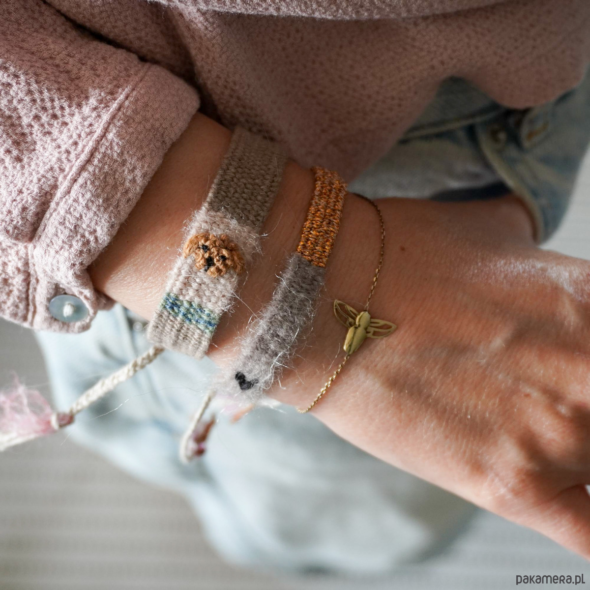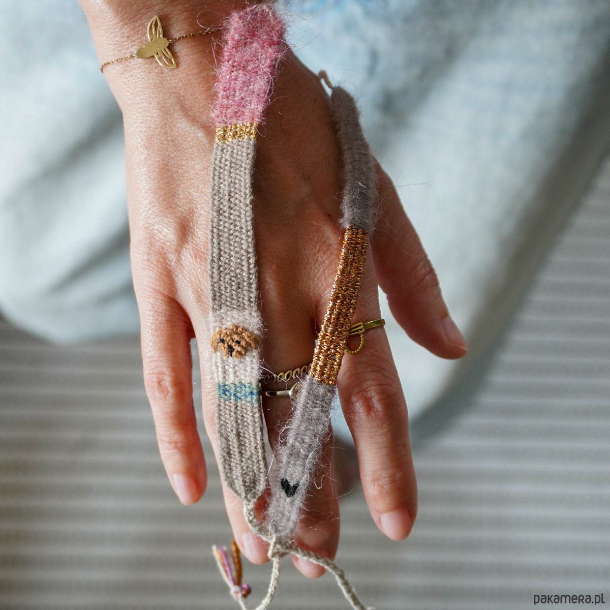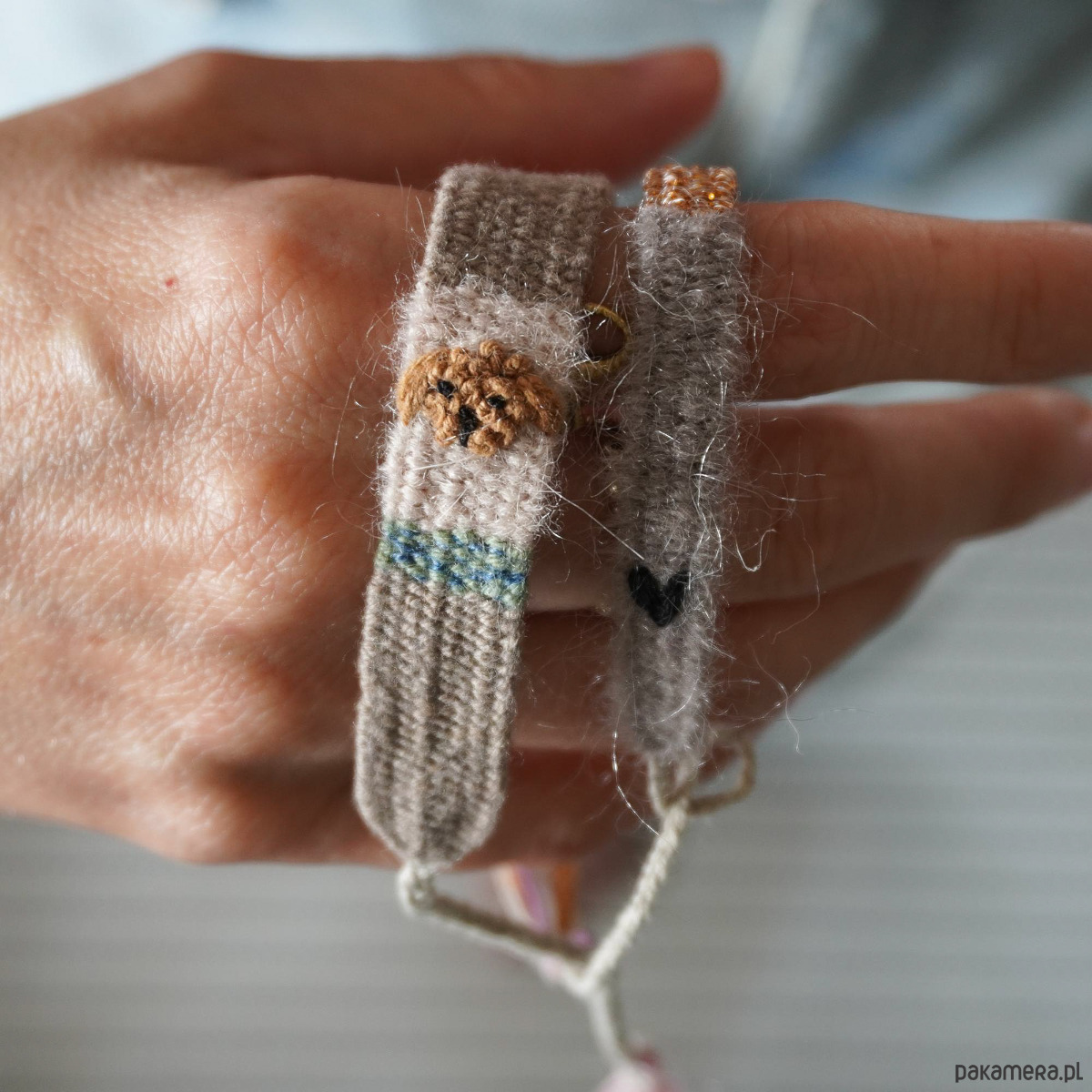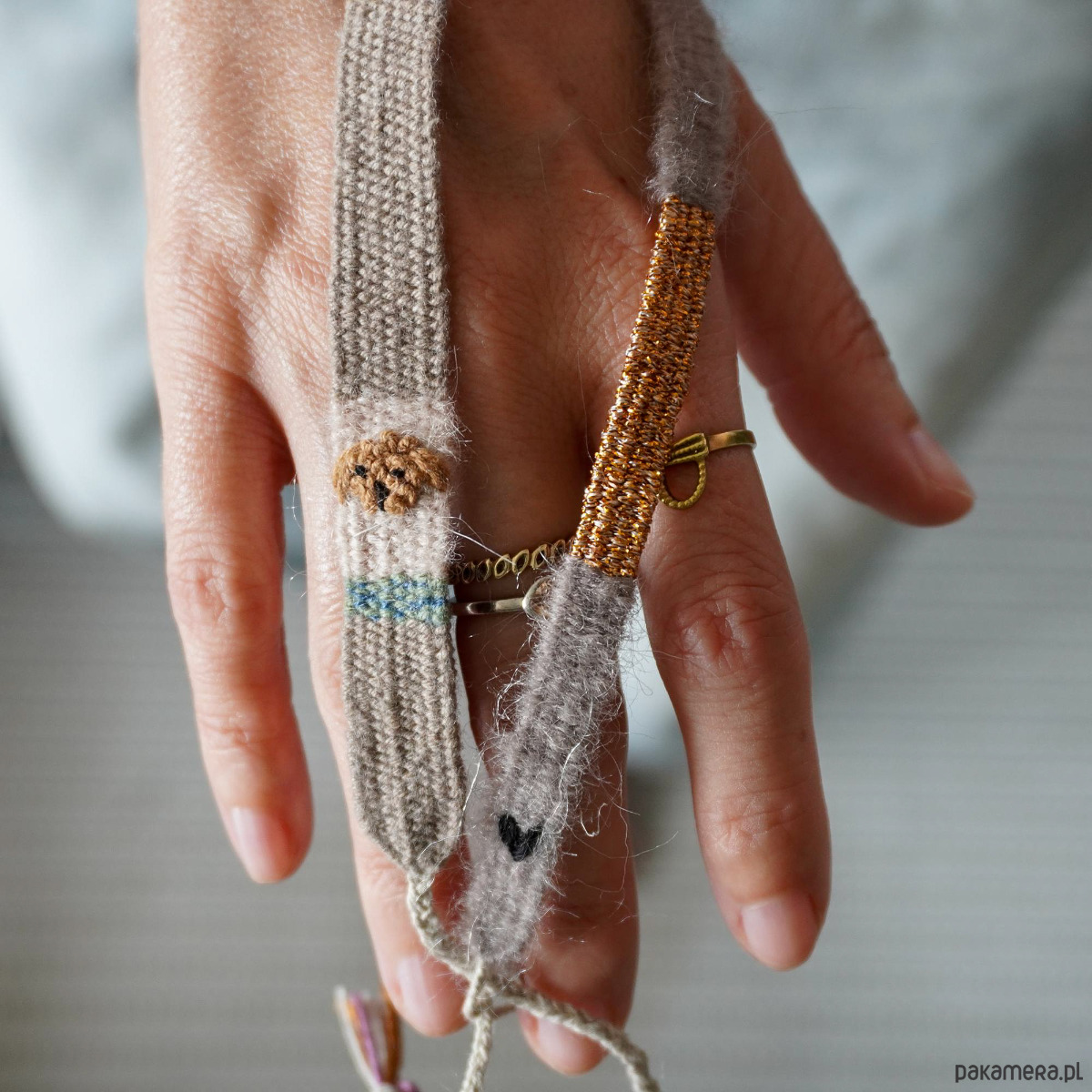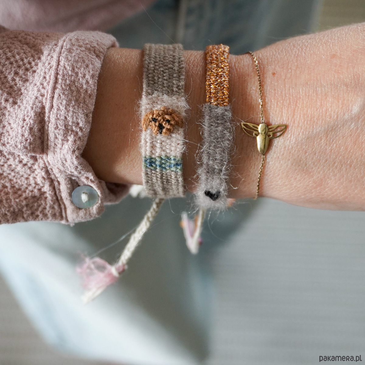 Prześliczny, unikatowy zestaw ręcznie tkanych bransoletek. Pierwsza jest z haftowanym pieskiem, druga z haftowanym serduszkiem i miedzianym, błyszczącym paseczkiem. Szerokość około 1 - 1,5 cm (z piesekiem) i 1 cm (z serduszkiem). Długość części tkanej 14, 15 cm. Bransoletki wiąże się zamodzielnie na supełek. Należy mocno go zaciskać lub zawiązać na 2 supełki dla pewności. Ten zestaw to idealny pomysł na prezent ♡.