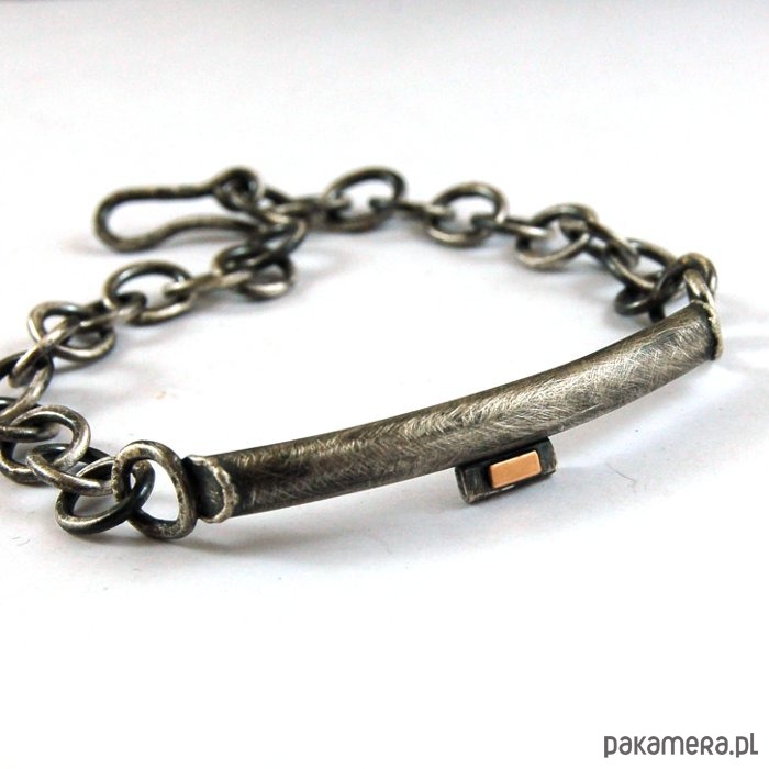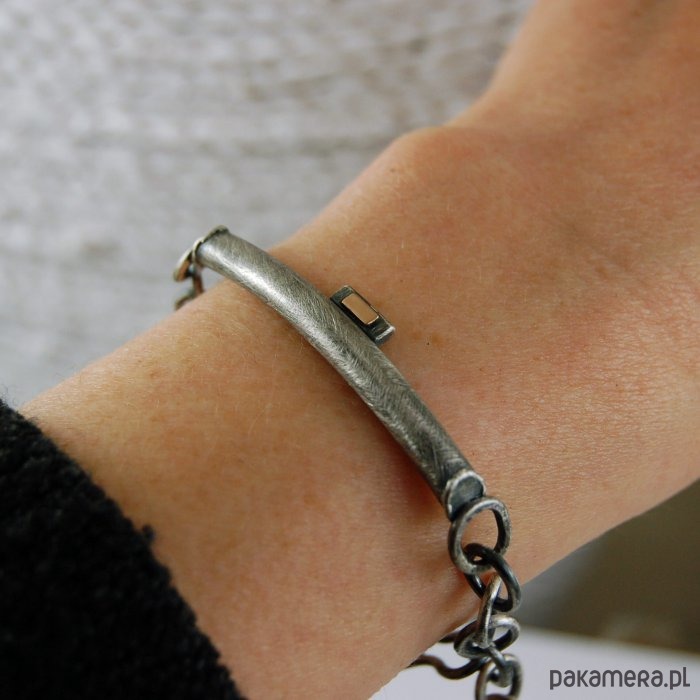 Bransoleta z oksydowanego srebra i złota próby 585. Srebro oksydowane i przetarte. Średnica centralnego elementu 0,5 cm, obwód 15 - 19 cm.
